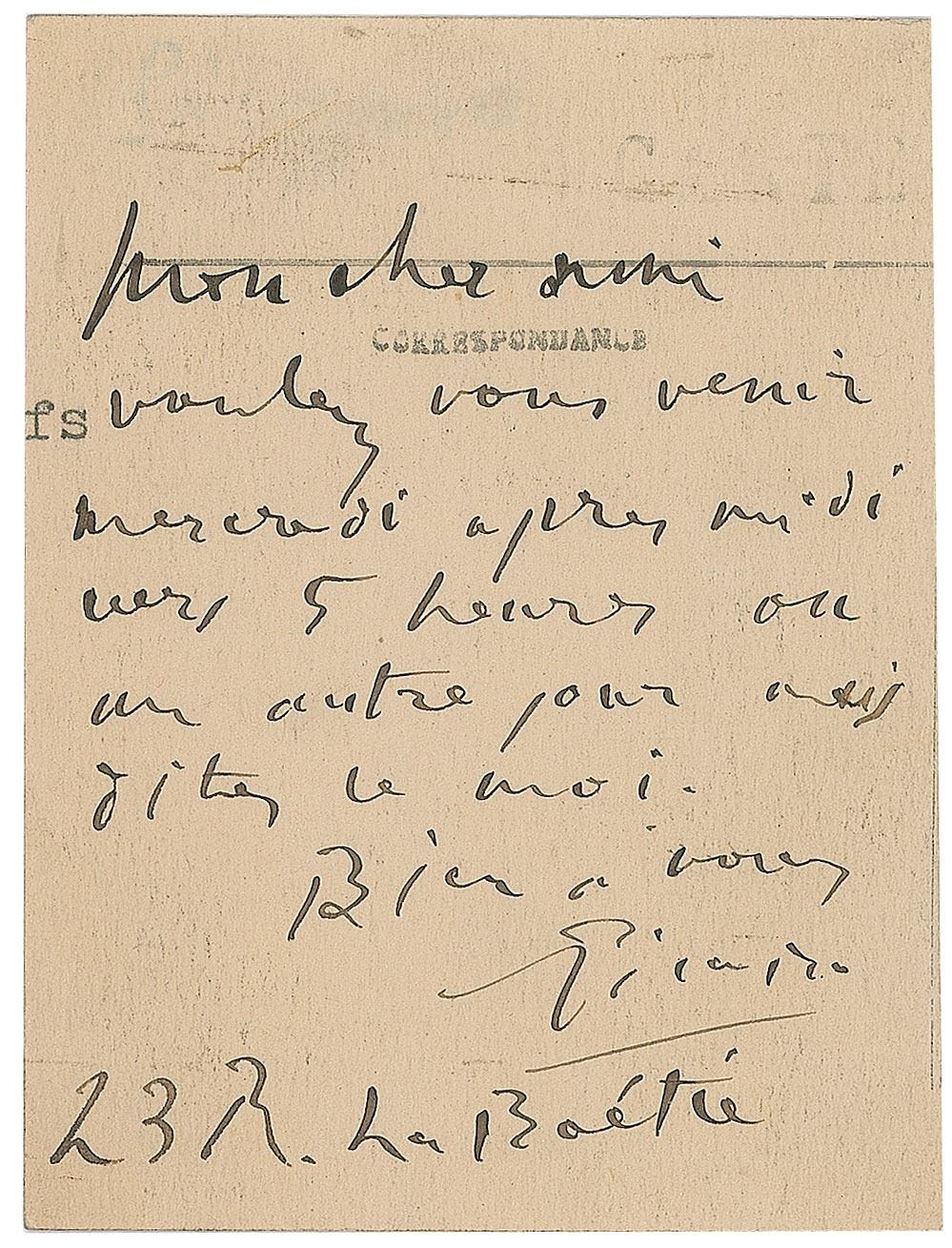 ANS in French, signed “Picasso,” one page, 2.75 x 3.5, no date but circa 1918–1940. Note written from his Parisian studio at 23 rue de La Boétie, in full (translated): "My dear friend, will you come on Wednesday at about 5 pm, or another day, but please tell me. Best wishes to you, Picasso, 23 R. la Boétie." In fine condition, with old mounting remnants on the reverse. The studio at 23 rue de La Boétie served as Picasso's home and workshop from 1918 to 1940.