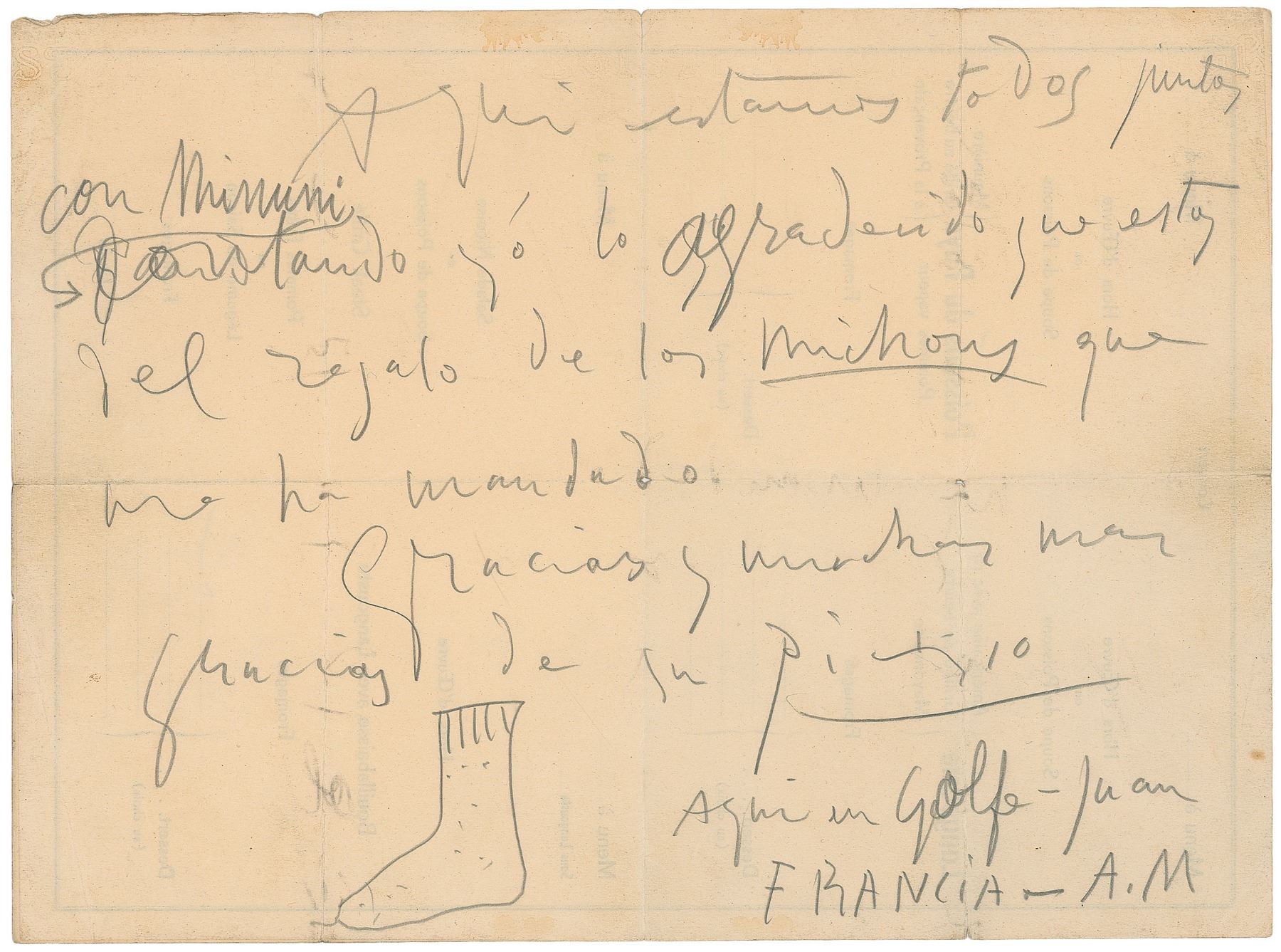 ALS in pencil in Spanish, signed “Picasso,” one page on the reverse of a 12.5 x 9.25 menu, no date. Picasso writes to thank his friend for sending him some socks, sketching a sock at the bottom. He also writes that he is with “Minuni,” a bullfighter whose hospital expenses had been paid by Picasso after seeing him injured in the ring. In very good to fine condition, with light handling wear, and small holes at fold intersections. A large, impressive letter featuring an original sketch by one of the most famous artists of the 20th century.