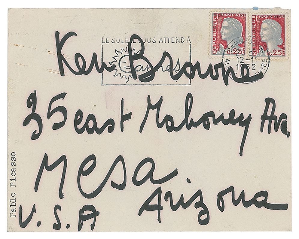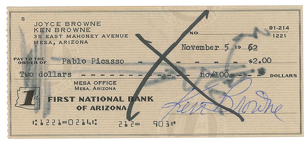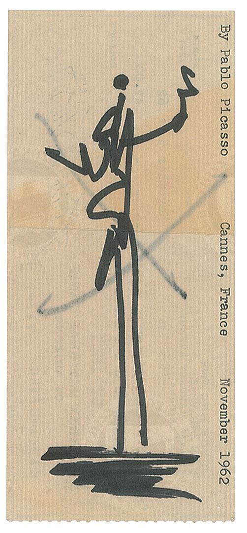 Primitive unsigned original black felt tip sketch of a man with raised arm accomplished by Pablo Picasso on the reverse of a 6.25 x 2.75 check made out to "Pablo Picasso" for two dollars, dated November 5, 1962. Includes the original mailing envelope postmarked at Cannes, France, which is prominently addressed in Picasso's hand in the same black felt tip to Ken Browne in Mesa, Arizona. In fine condition, with a central fold and some light toning. A unique piece of original artwork by Picasso, whose artistic sensibilities were no doubt inspired by prehistoric works—after viewing the famed cave paintings at Lascaux in 1940, he reportedly remarked: 'We have invented nothing.'