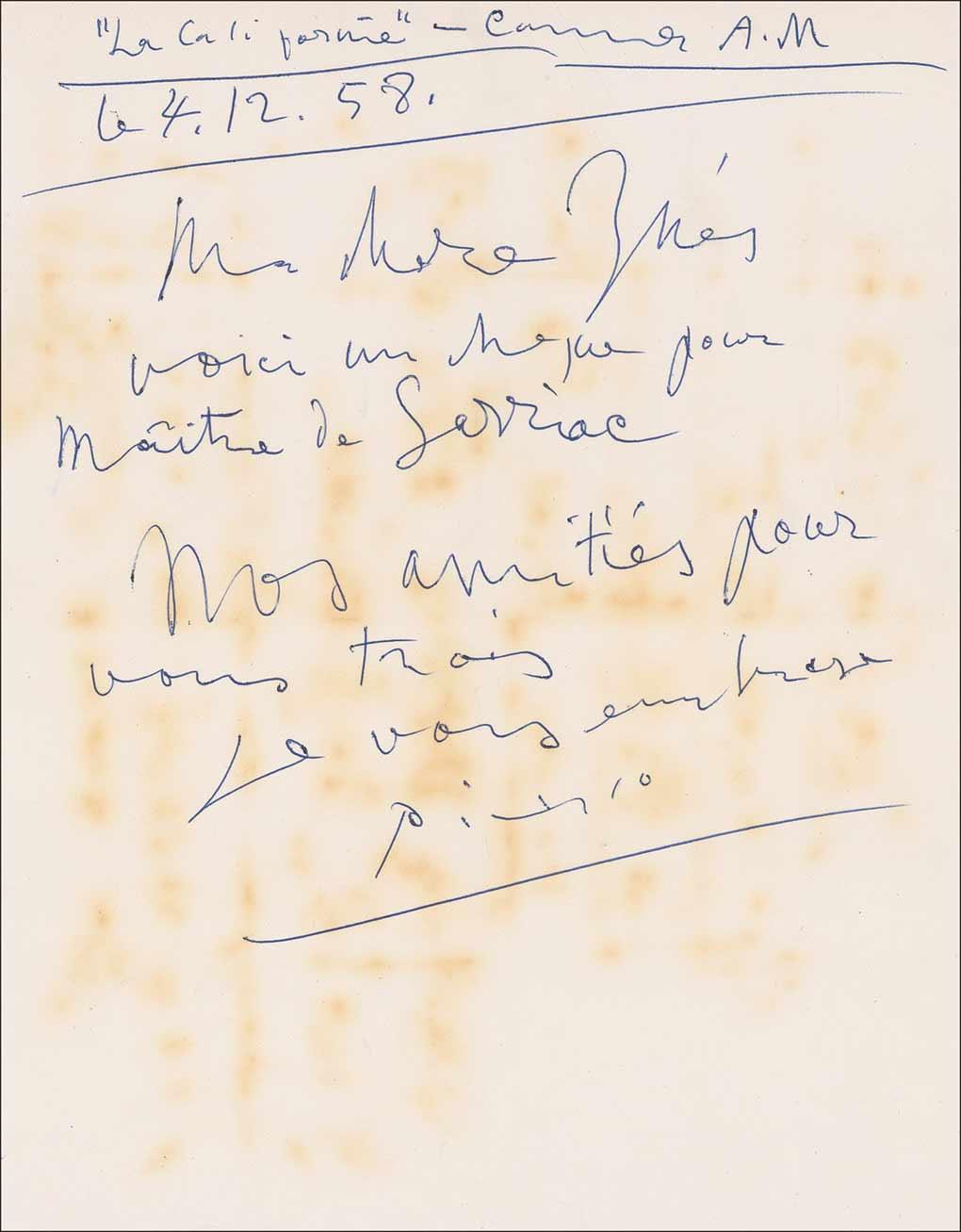 Brief ALS in French, signed “Picasso,” one page, 8.25 x 10.75, April 12, 1958. Picasso writes from “La Californie,” Cannes, to Inés [Sassier, his housekeeper], enclosing a check (not present) and sending good wishes. Intersecting folds, one through a single letter of signature, and light overall toning, not affecting legibility and clarity of Picasso’s writing, otherwise fine condition.