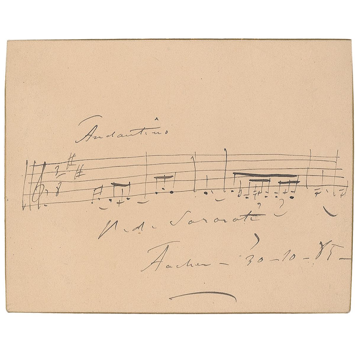 Spanish violinist and composer (1844-1908). AMQS on a gilt-edge 4.5 x 3.5 card. Sarasate pens six detailed bars from an unidentified work, headed at the top, “Andantino,” signed at the bottom, “P. d. Sarasate-30-10-85.” In fine condition.