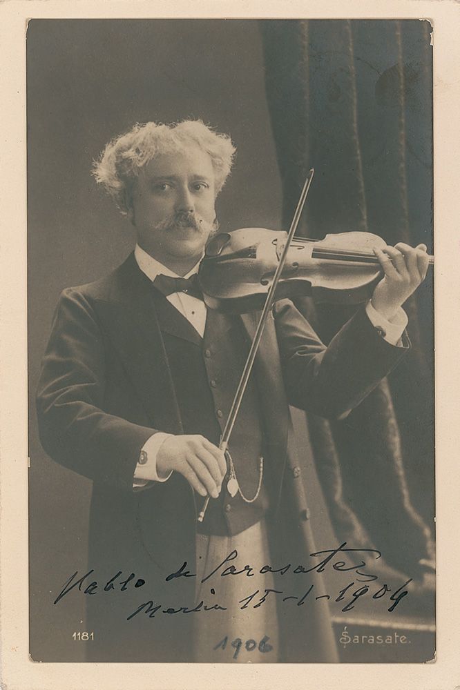Spanish violinist and composer (1844–1908). Vintage 3.5 x 5.5 real photo postcard photo of de Sarasate posing with his violin, signed in black ink, “Pablo de Sarasate, Berlin 15-1-1904.” Affixed to a slightly larger card. Some surface impressions and rubbing, light silvering to dark areas of the image, and a pencil notation to the bottom, otherwise fine condition.