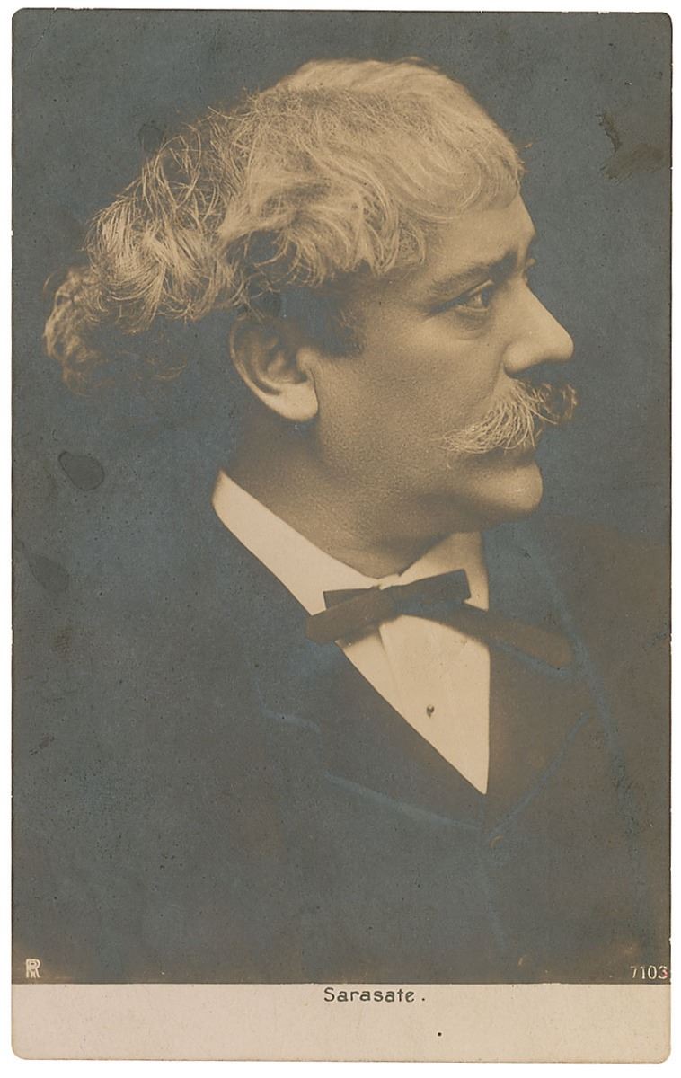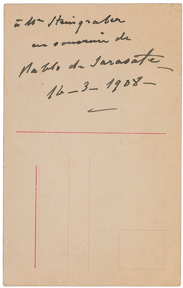 Spanish violinist and composer (1844-1908). Vintage 3.25 x 5.25 postcard photo, signed and inscribed in fountain pen in French, "To Madame Steingraber as a souvenir of Pablo de Sarasate 16 - 3 - 1908." In fine condition, with scattered mild silvering to image side.