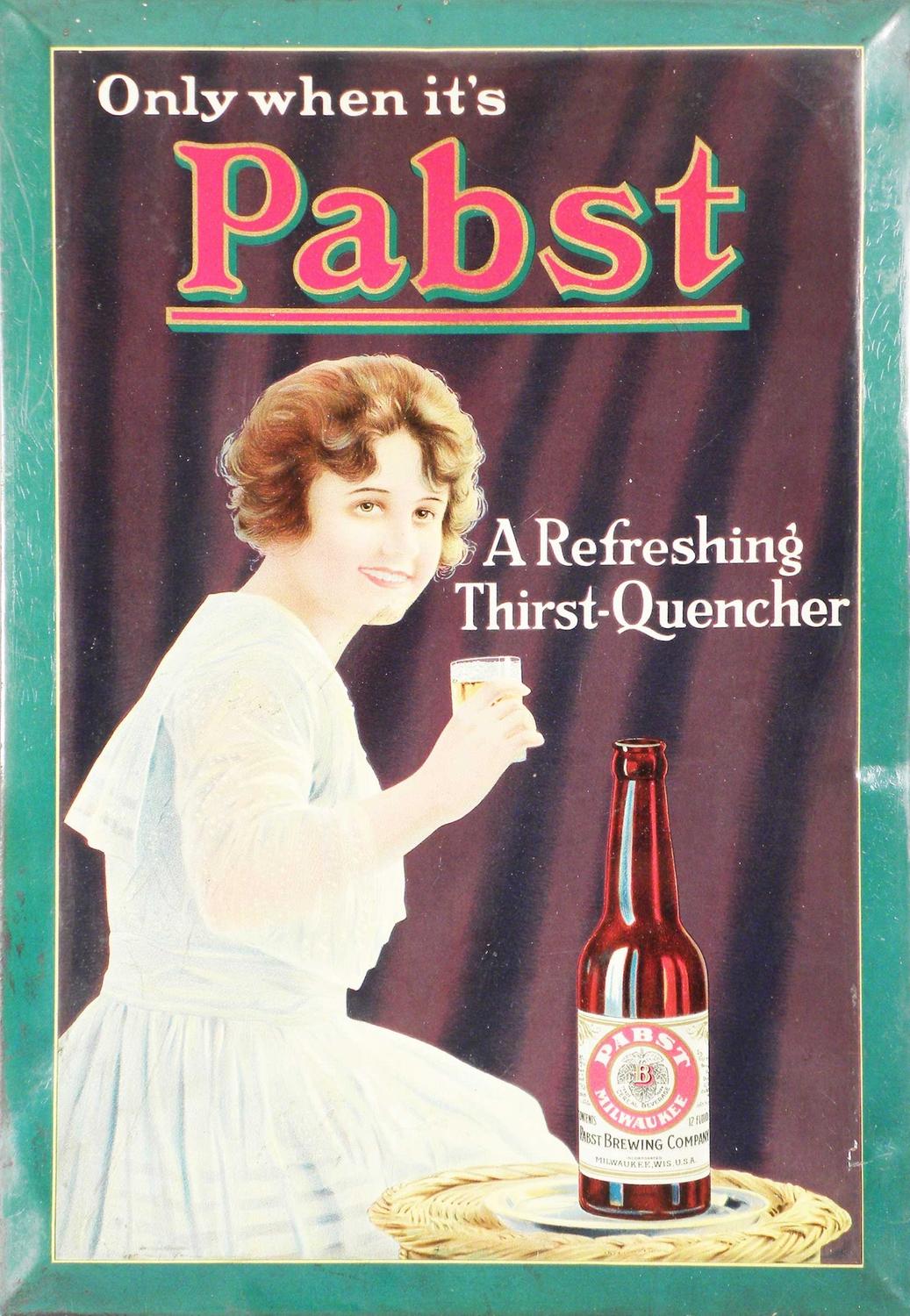 Pabst Beer Beveled Tin Over Cardboard Sign. Depicting young woman drinking a glass of beer. Entitled, "A refreshing thirst quencher". A few minor creased otherwise excellent condition. 9 1/4 X 13 1/4 inches.