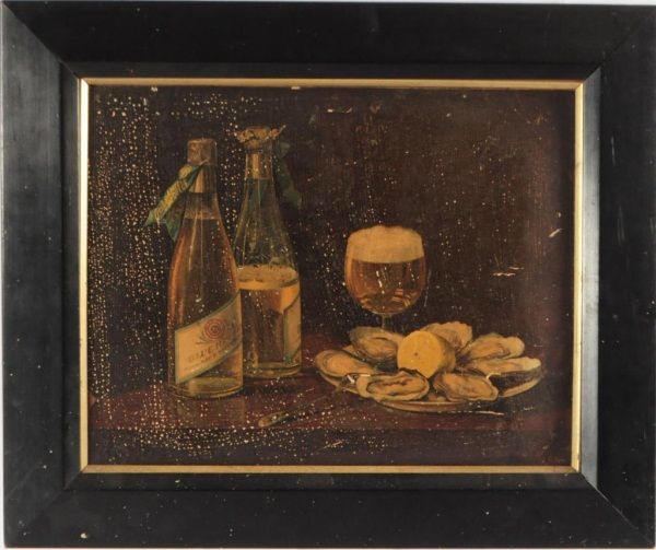 Cardboard sign in frame, with some loss on image, frame warped. Image measures 18 1/2" wide x 14 1/2" tall.