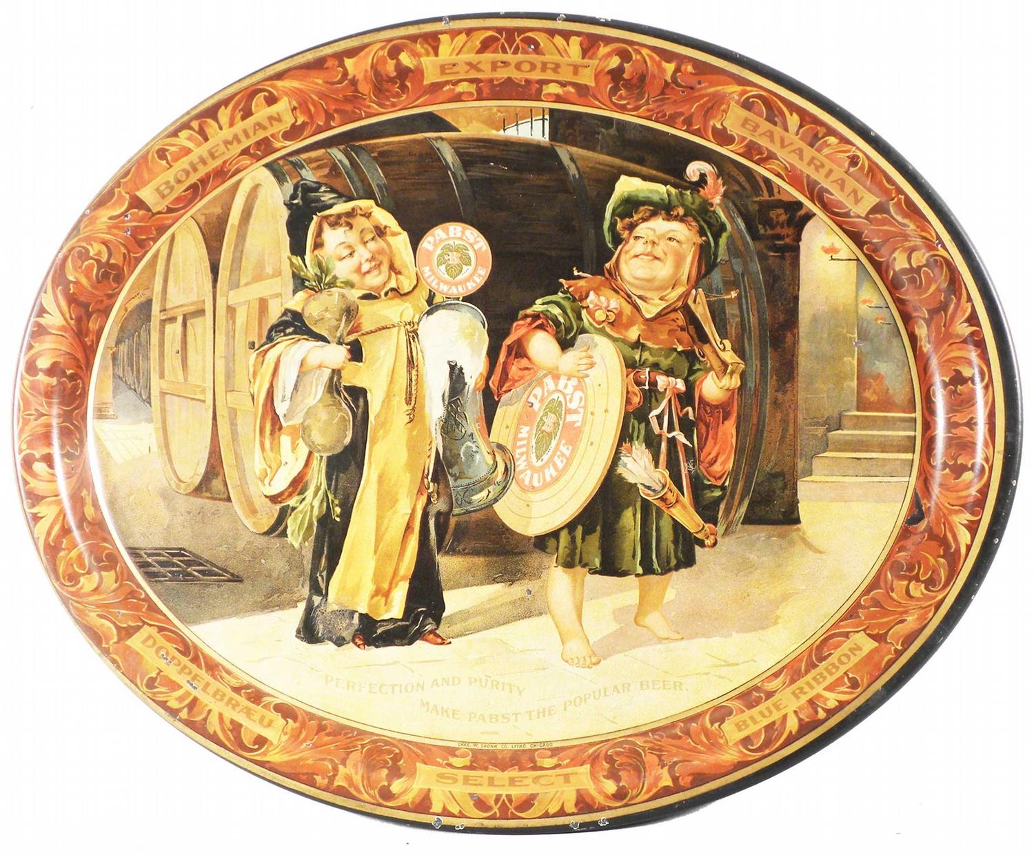 Pabst Beer Tin Serving Tray. Advertising Bohemian, Export, Bavarian, Doppelbraeu, Select and Blue Ribbon. Chas. W. Shonk Co. Lithographers. Some normal crazing, a small rust spot at 7:00 and small dent at 4:00 otherwise good condition. 18 1/2 X 15 1/4 inches.