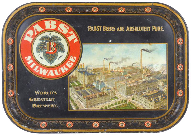 Pabst Beer tray, colorful litho on metal w/Milwaukee factory scene by The Tuscarupa Co.-Coshocton, O., c.1910, VG cond, 12"H x 17"W.