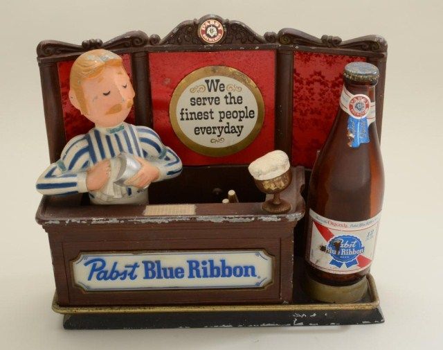 Pabst Blue Ribbon Beer Advertising display (lighted) showing bartender and bottle with bar in background in fair to good condition; circa 1950s-1960s. Est.: $100-$300.