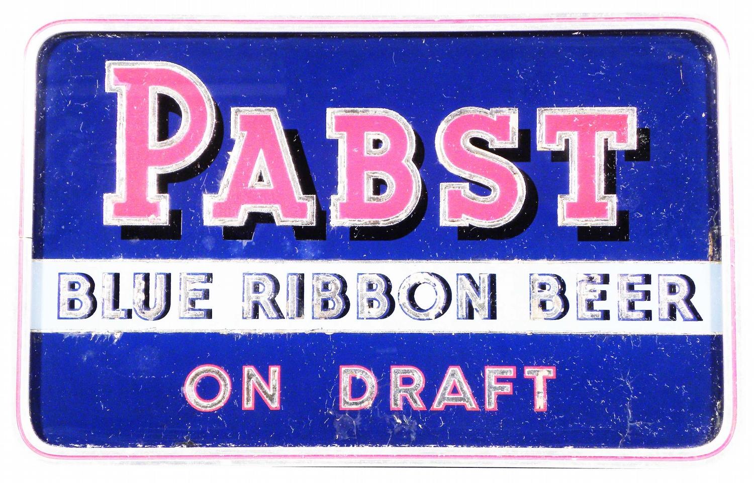 Pabst Blue Ribbon Beer, "On Draft" Reverse Glass Sign. Aluminum frame easel backed and chain hanger. Rounded corners. A few spots of lifting otherwise very good condition. 14 X 9 inches.