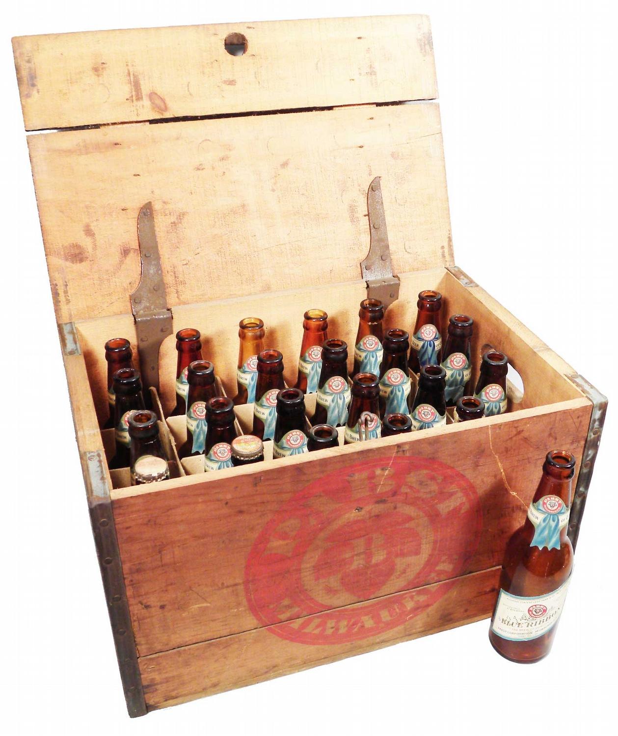 Pabst Blue Ribbon Beer Wood Crate with 21 beer bottles all have original paper labels except two. Excellent condition.