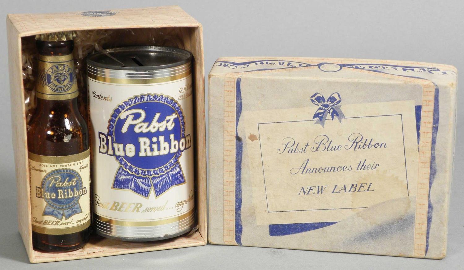 Pabst Blue Ribbon New Label Announcement Premium. Very good condition. Beer Can Bank and Miniature bottle in original box. Bottle measures 4 1/4 inches tall.