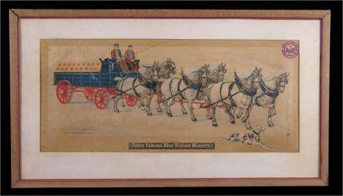 "Pabst Blue Ribbon" ad sign depicting 6 horses & wagon 20 x 36 "