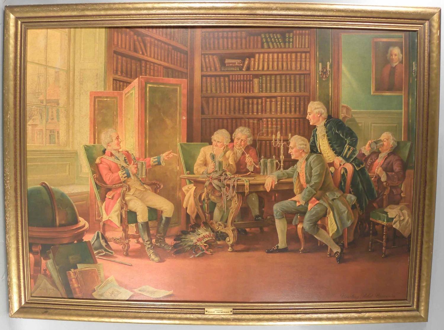 Pabst Brewing Co. Early Print depicting Colonial Library scene showing prominent forefathers in a casual discussion. Indian Beaded Accessories on the table and a Full Indian Chief head dress is sitting under the table. Excellent condition. 46 X 34 inches.