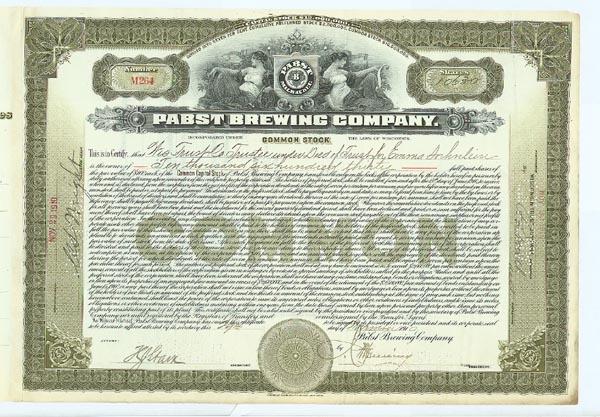 1910, Wisconsin. Stock certificate for 10630 shares. Olive/Black. Vignette of two seated female allegorical figures flanking company logo at top center. Perferation cancelled and very fine.