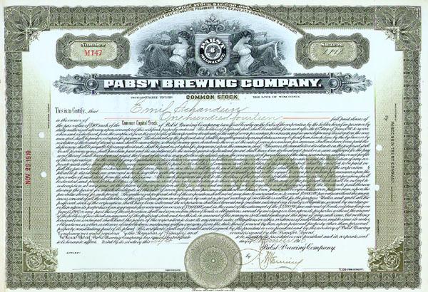 1910, Wisconsin. Stock certificate for 114 shares. Olive/Black. Vignette of two seated female allegorical figures at top center flanking the company logo. Punch cancelled. Very fine.