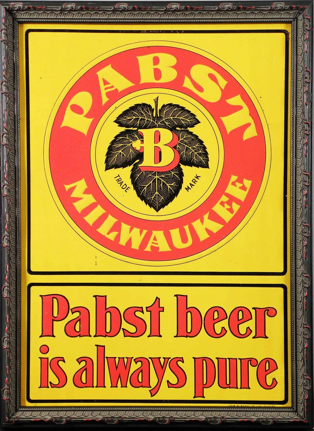 Pabst Milwaukee Embossed Tin Sign. "Pabst beer is always pure". Paint lifting in small area across top otherwise very good condition. 9 1/2 X 13 1/2 inches.