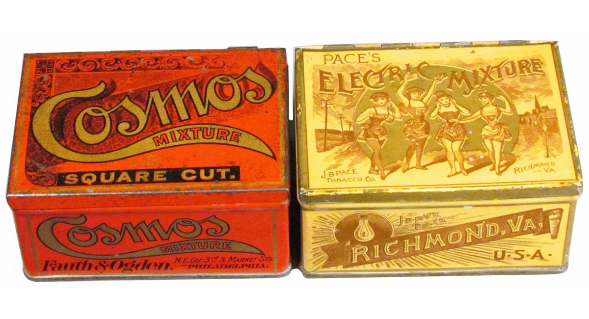 Pace's Electric Mixture and Cosmos Mixture Tobacco Tins. Both tins have minor tiny chips otherwise both in good condition.