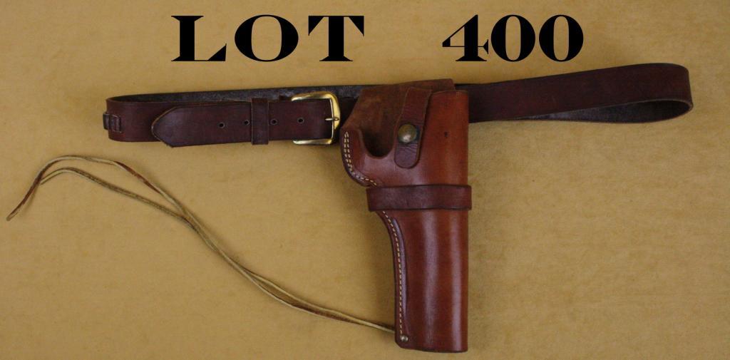 Pachmayr tan leather “scout” holster and cartridge belt for a small frame revolver with approx. 6” barrel in overall good condition. Est.: $50-$75.