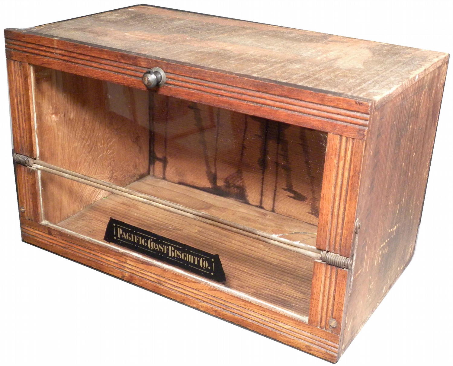 Pacific Coast Biscuit Co Wood Display Case. Portland Cracker Co. paper label on side. Small crack in top glass panel otherwise very good condition. 17 1/2 X 11 X 11 inches.