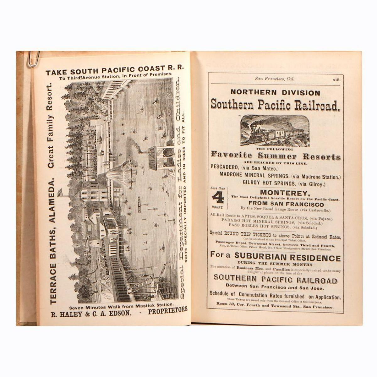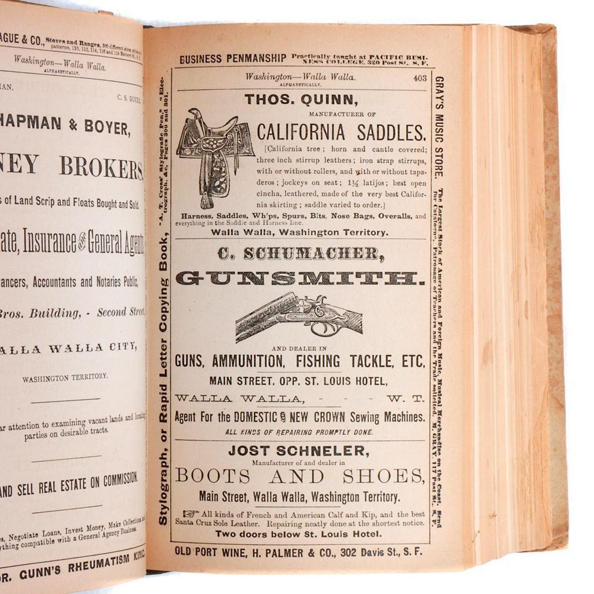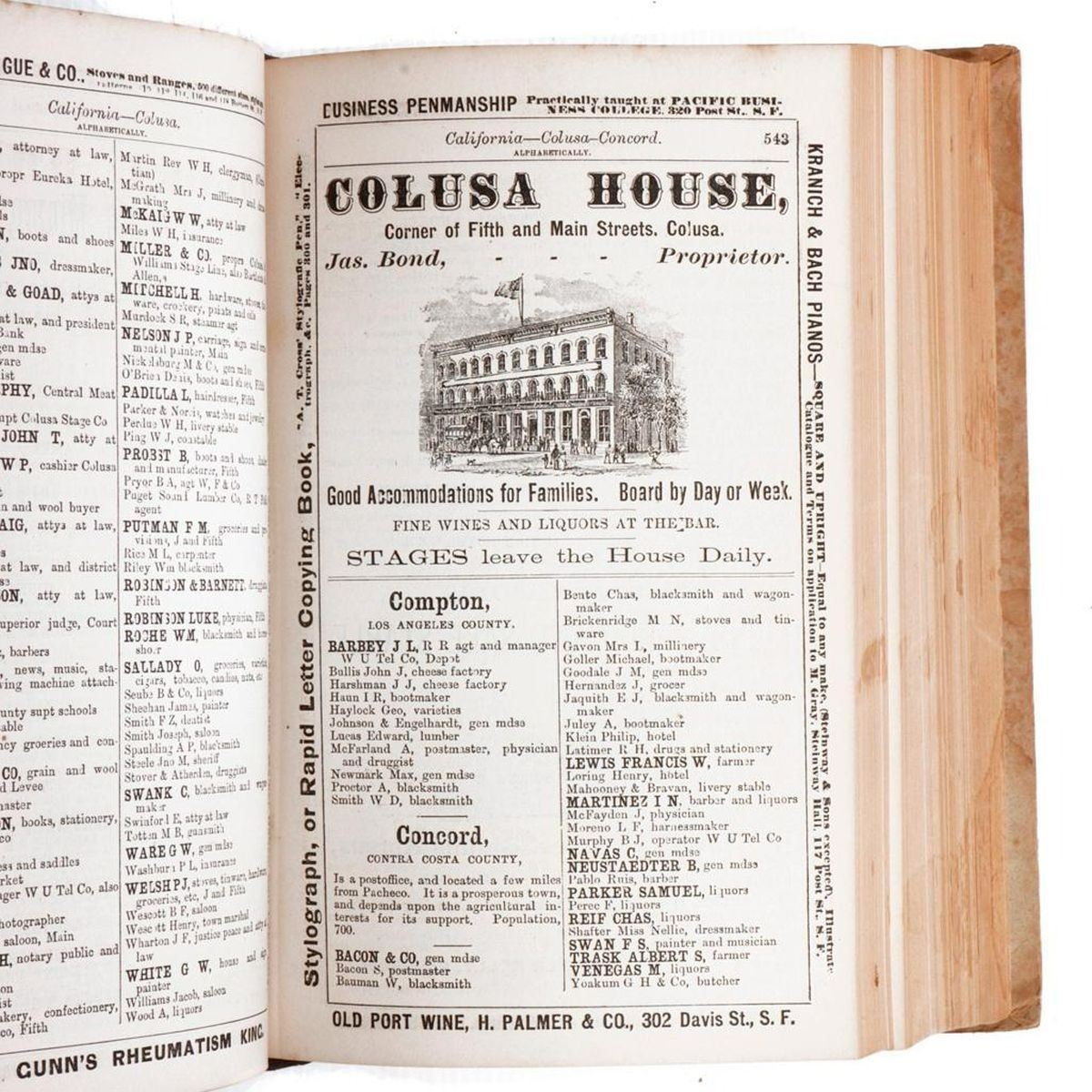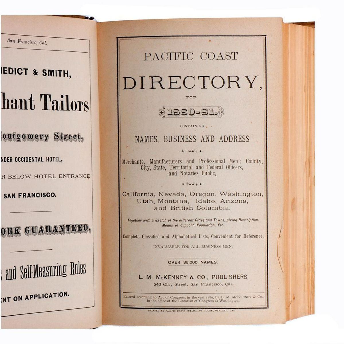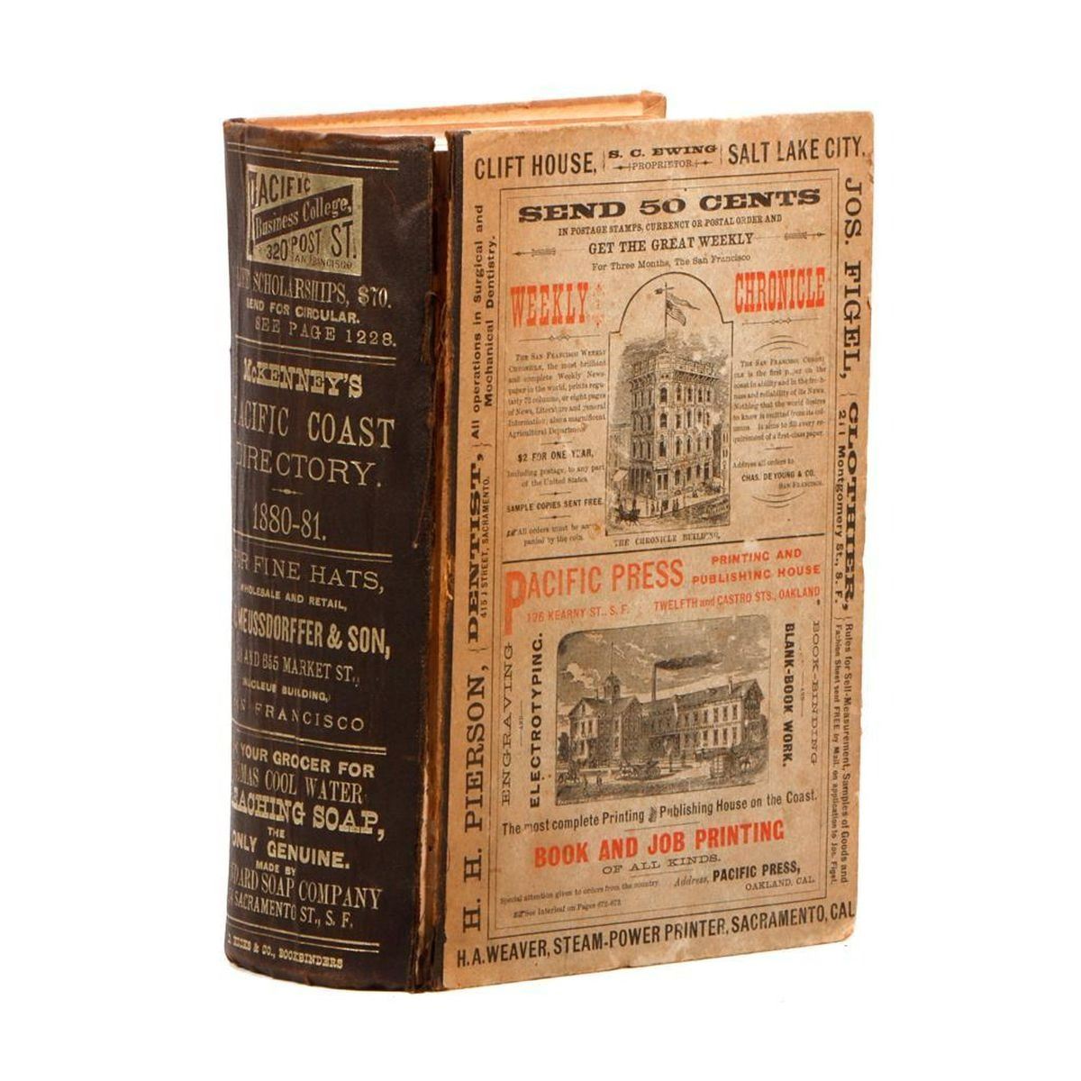 PACIFIC COAST DIRECTORY, 1880-81. Containing Names, Business and Address of Merchants, Manufacturers and Professional Men; County, City, State, Territorial and Federal Officers, and Notaries Public, of California, Nevada, Oregon, Washington, Utah, Montana, Idaho, Arizona, and British Columbia... San Francisco: L. M. McKenney & Co., Publishers, 1880. 8vo. Original half gilt-stamped cloth and printed paper boards. 30 pages of ads at front (1 leaf missing), and scattered throughout. Condition: Fair-Good; the front cover is split but still attached to underlying cloth; some "wrinkling" to spine; toning/light staining, scuffing to boards; at least one leaf missing at front; later owner's inscription; pages throughout overall very clean.