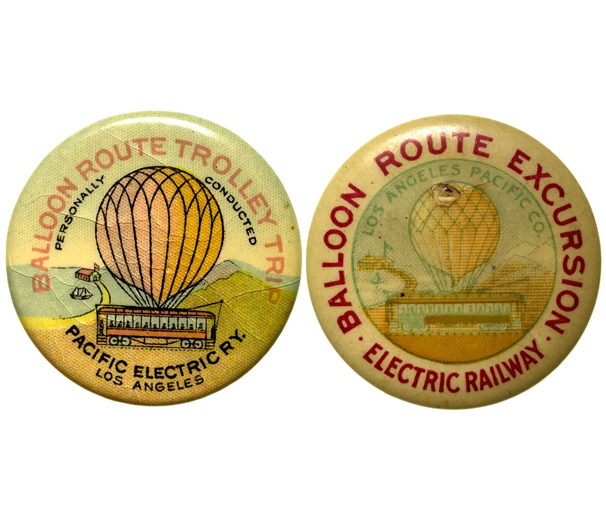 Lot of 2. One says Balloon Route Trolley Trip/Personally Conducted with no mfg card on back and one says Balloon Route Excursion and is made by the L.A. Badge & Mfg. Co. 149 Main St. The first pin shows cracks and creases on front of pin and is missing the pin back. The second has a flaw in the center on the picture of the balloon and is also missing the pin back. Both pins are faded. - Weber Collection -58499