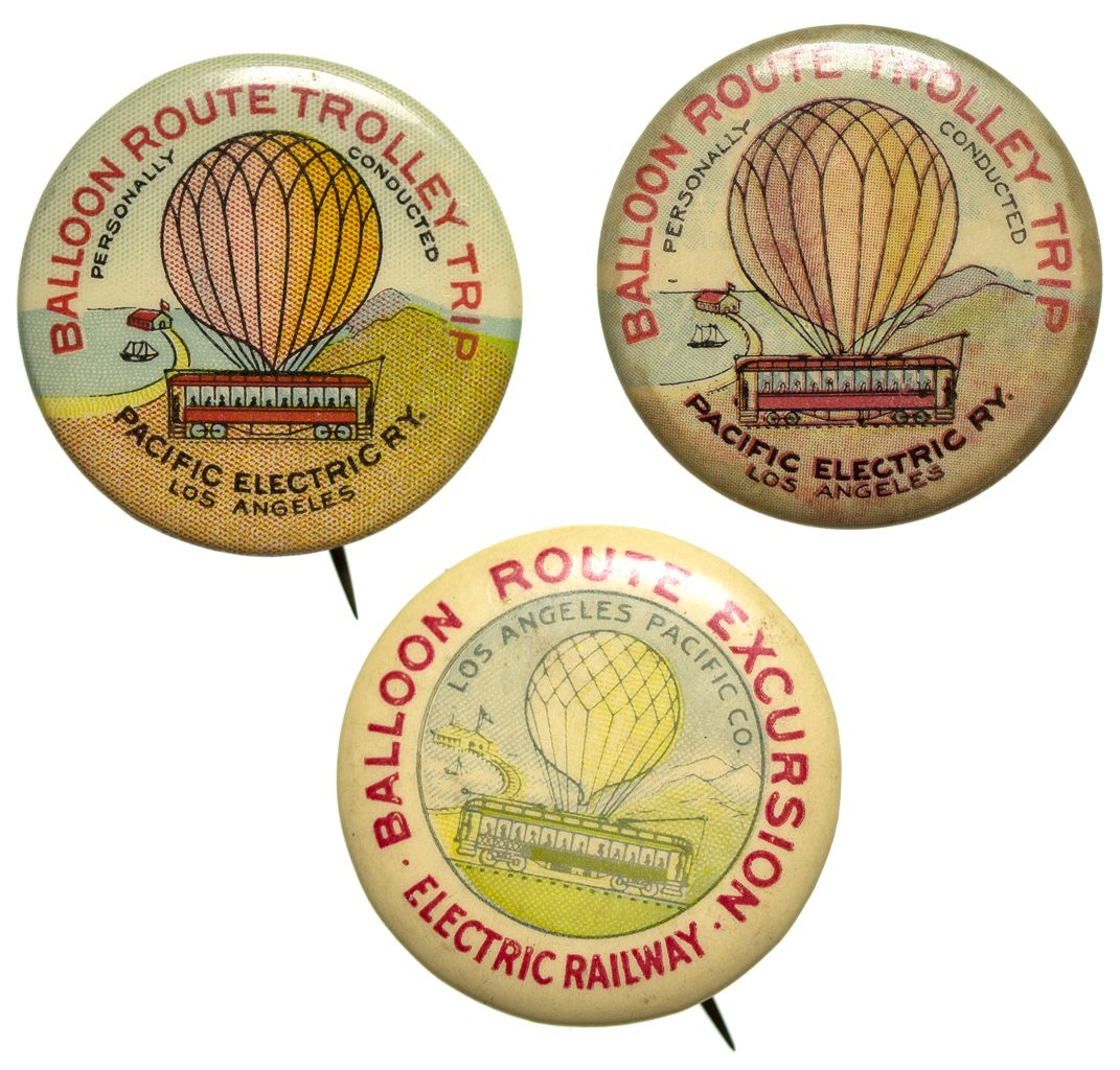 Lot of 3. RARE, colorful, pictorial, approx 32mm in very good to excellent condition. Two are the same and say Balloon Route Trolley Trip/Personally Conducted, but one is made by L.A. Badge & Mfg. Co. 342 S. Broadway and one is made by Ehrman Mfg. Co. in Malden Mass. The third just says Balloon Route Excursion and is made by the L.A. Badge & Mfg. Co. 149 Main St. The third is marked RARE by Bill Weber. The Balloon Route Trolley Trip was the most famous trolley trip in the west. For more on this colorful, historic trolley trip excision please visit ERHA.org and read a first hand account of the Balloon Excision told by C.M. Pierce, the legendary L.A. Icon who was largely credited with the popularity of this trolley trip. - Weber Collection -58487