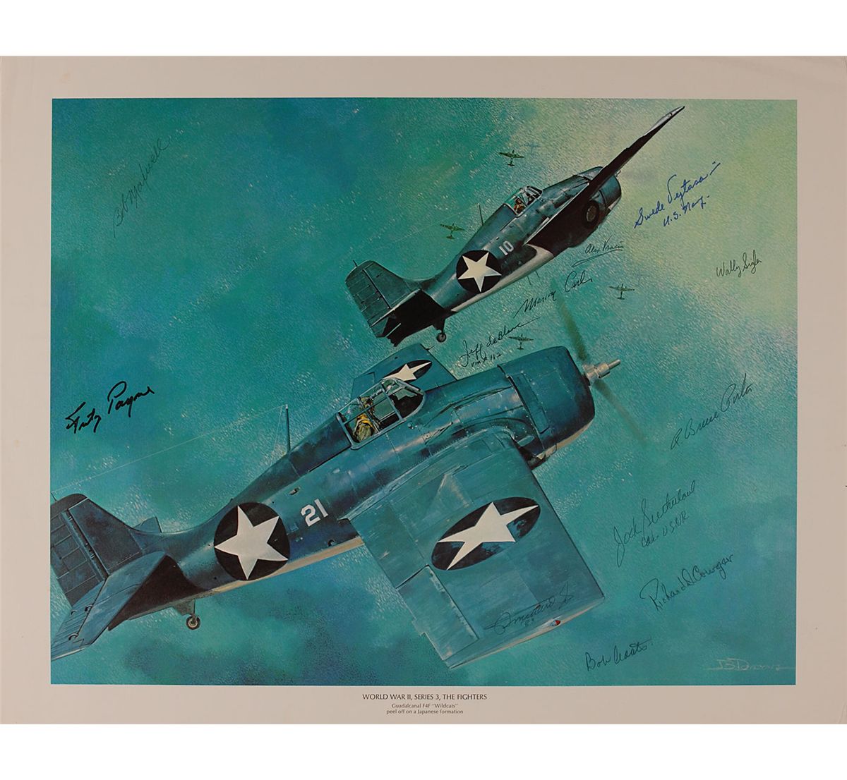 Color 22.75 x 18 print entitled ‘The Fighters’, signed in blue and black ink by Bob Maxwell, Frederick Payne, Swede Vejtasa, Alex Vraciu, Marion Carl, Jeff DeBlanc, Wally Sigler, R. Bruce Porter, John Sutherland, Richard Cowger, Bob Coats, and Louis Menard, Jr. In fine condition, with a couple signatures a bit light, and light creases to right corner tips.