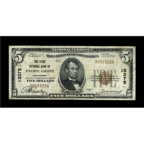 <B>Pacific Grove, CA</B></I> - $5 1929 Ty. 1 <B>The First NB</B></I> Ch. # 13375<BR>While hardly classifying as rare, notes from this upscale Monterey County location are always in demand. <B>Fine.</B></I><BR><BR><b>Shipping:</b> Coin/Currency (<a target="_blank" href="http://www.heritageauctions.com/common/shipping.php">view shipping information</a>)