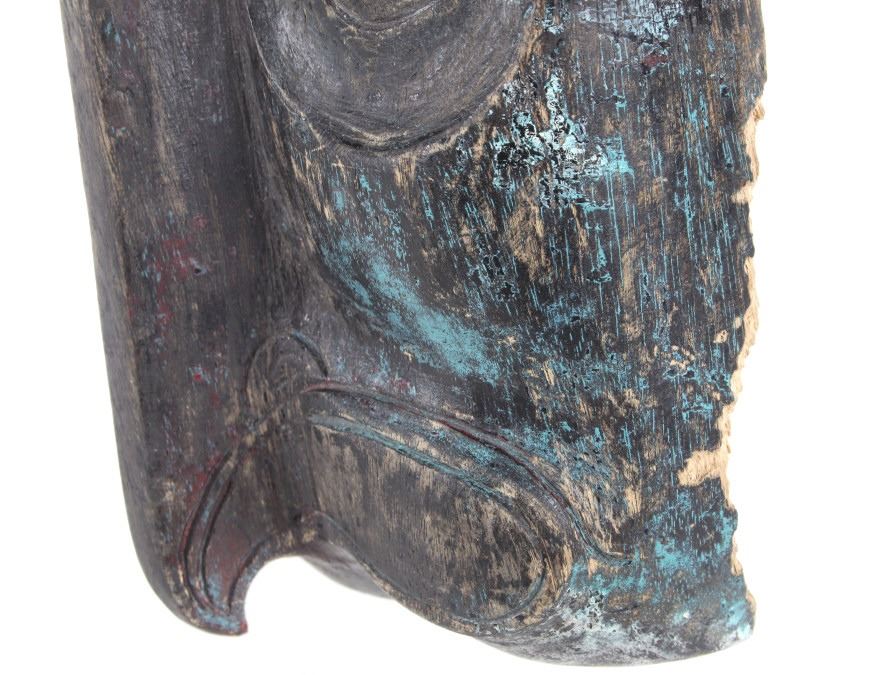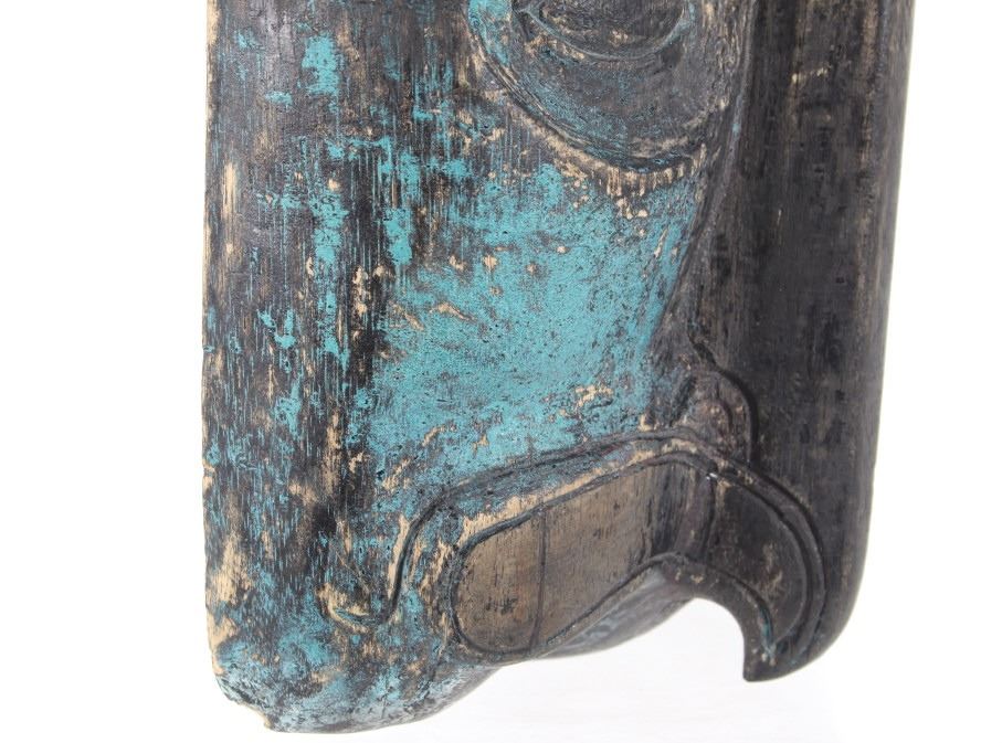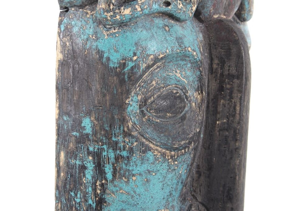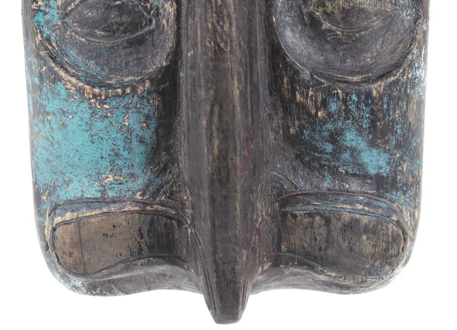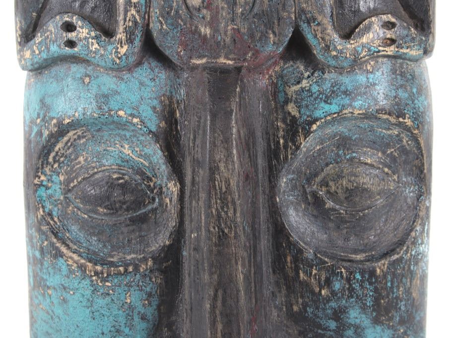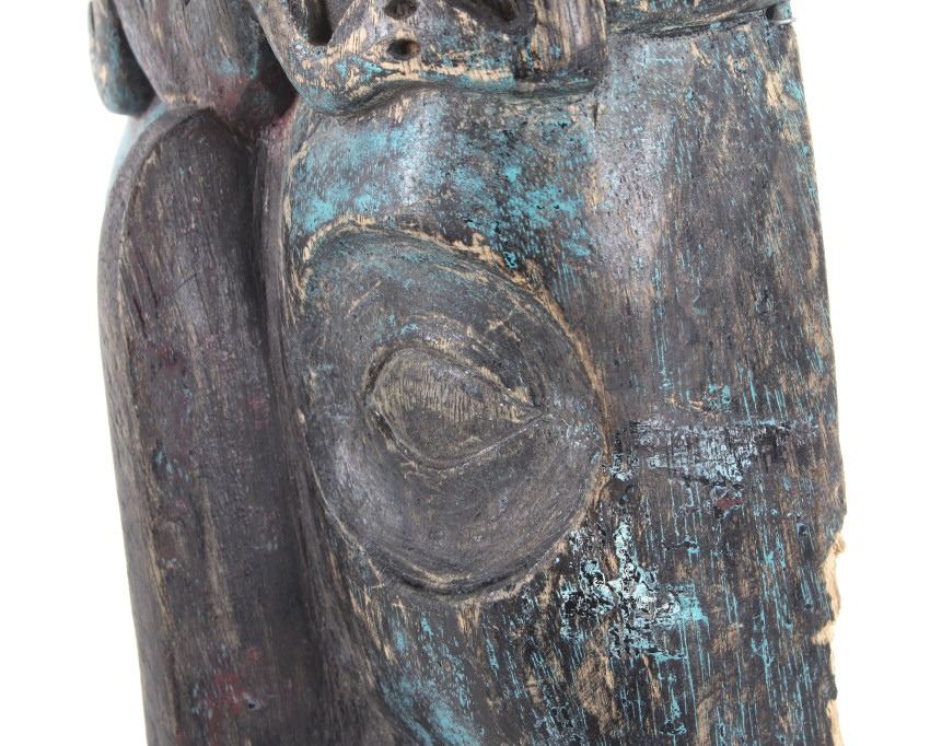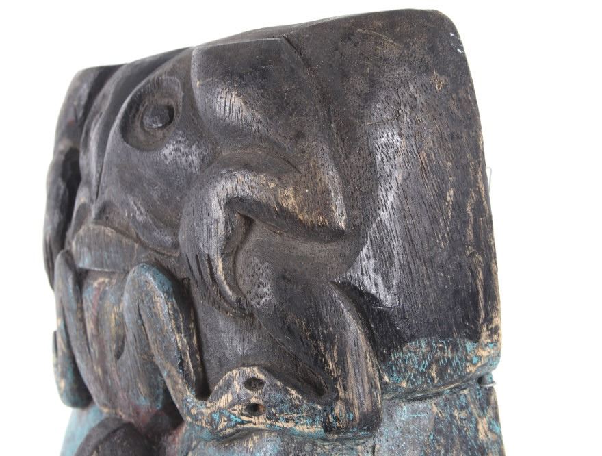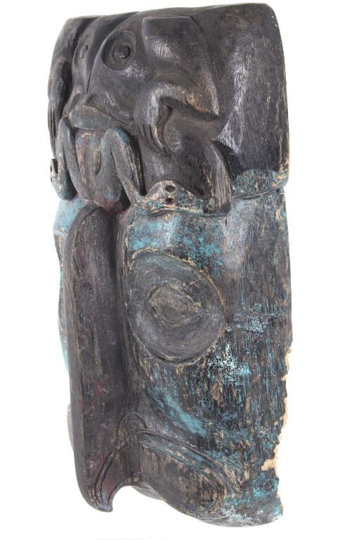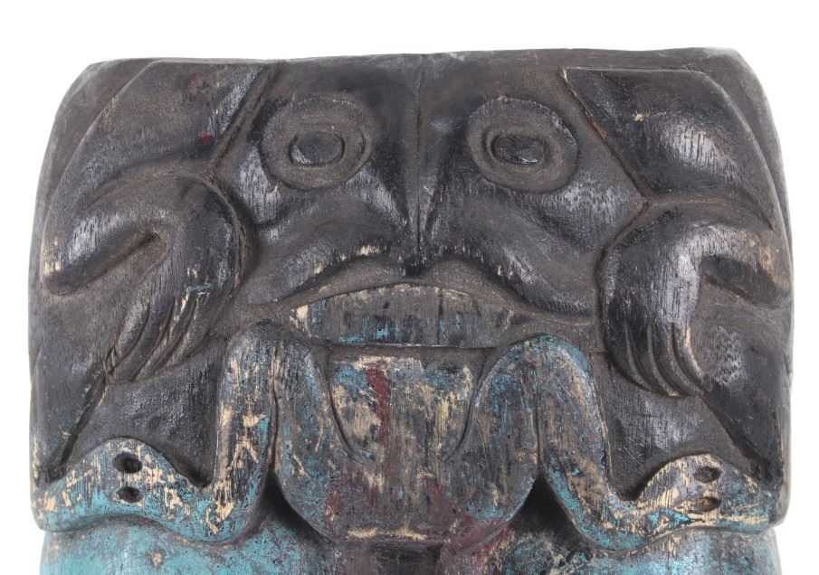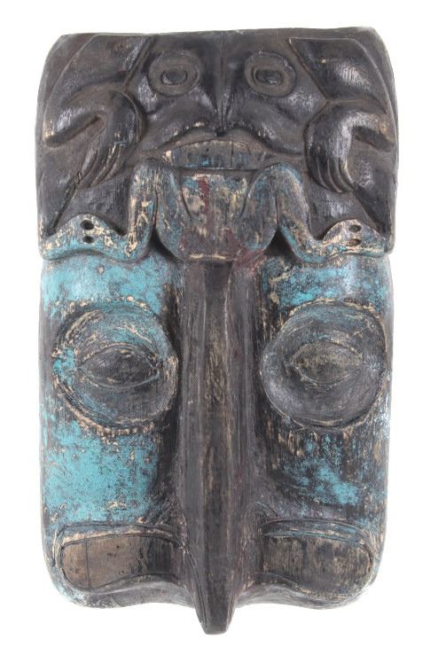 Featured in this lot is this Pacific Northwest Coast totem mask circa mid 1900's. The mask features a wonderfully and professionally crafted totem design that shows a face at the top of of the totem and shows a beaked face as the main decoration of the mask. The condition of this mask is fair with some wear due to age and shows some chipping to the backside of the mask and showing some fading to the blue coloration and to the wood the mask is constructed from but otherwise is in fair overall condition. The measurements of this mask are 12 1/8" x 7 1/2" x 4".