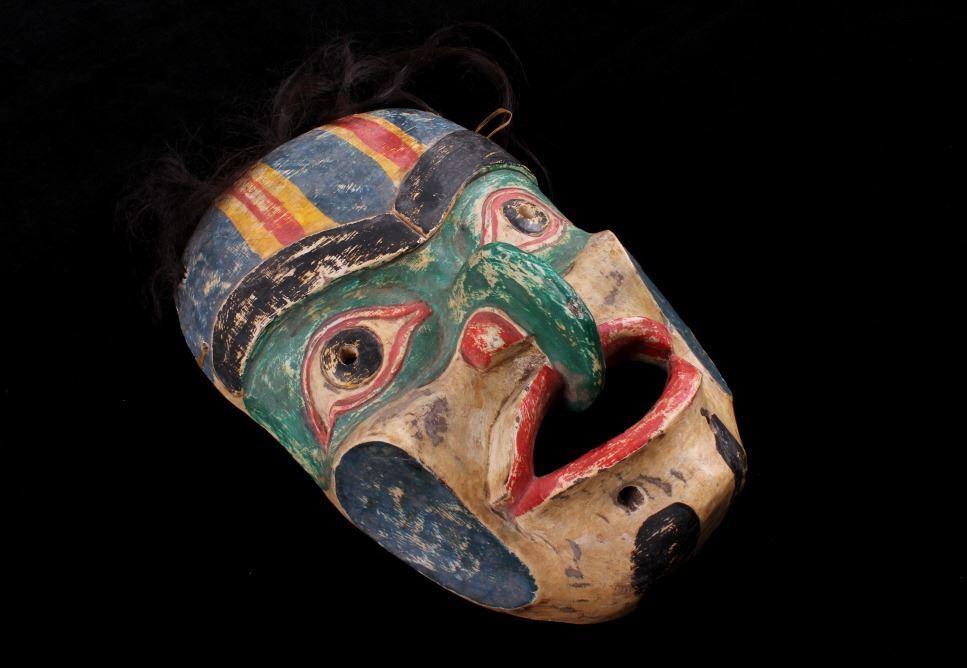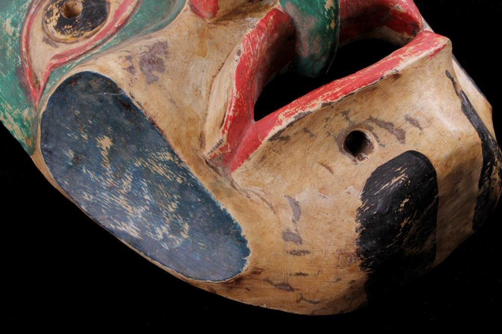 For your consideration is this Pacific Northwest, Kwakiutl "Spirit Wrestler" mask, circa early 1900's. This mask shows a bold figural design and construction, boasting a wonderful addition of horse hair to its crown and polychrome green around the eyes and the nose. The construction is consistent with other “Spirit Wrestler” masks. The mask shows blue clipped jowl cheeks with red painted lips. The mask is constructed of cedar bark and is hand carved. Masks are highly valued by the Kwakiutl, serving as potent manifestations of ancestral spirits and supernatural beings and offering these supernatural entities’ temporary embodiment and communication through dance and other kinds of performance. The condition of this mask is good, with some wear to the paint consistent with age and ceremonial usage; however, the mask shows good, overall condition. The measurements of this mask are 13" x 8 1/2" x 5".