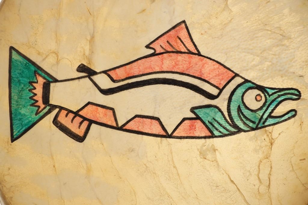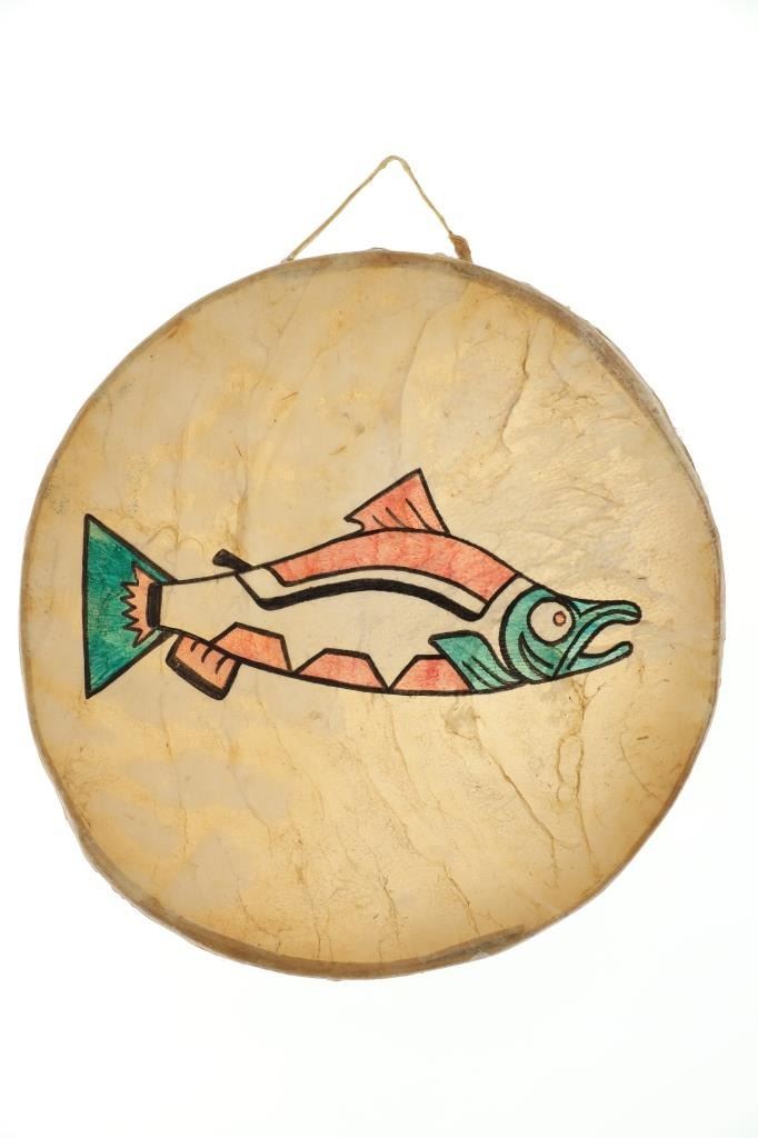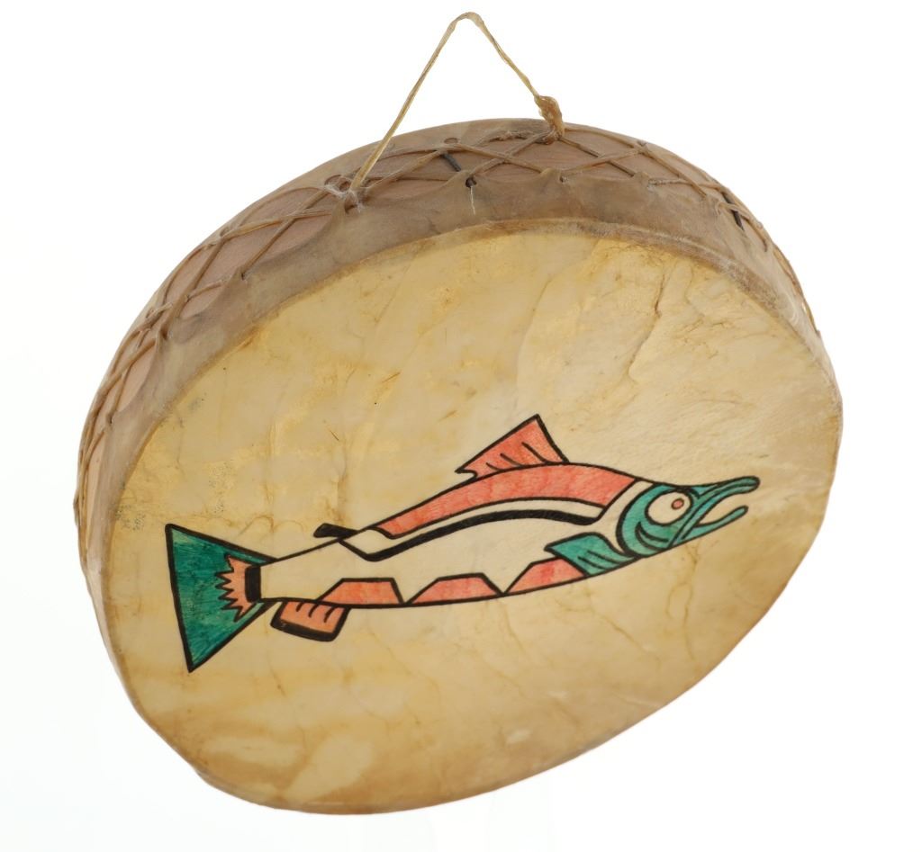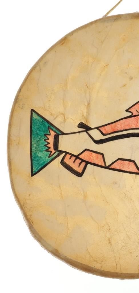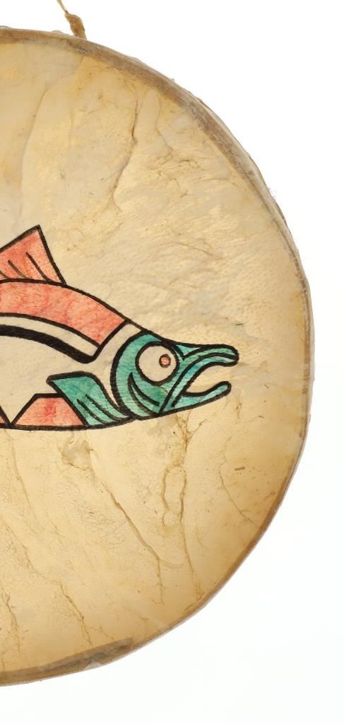 Featured in this lot is this Pacific Northwest polychrome salmon drum circa 1960's. The drum features a wonderfully and professionally crafted stretched rawhide and wood frame with a polychrome painted salmon painted on the face of the drum. This drum would have been used for ceremonial purposes. The condition of this drum shows a preserved condition with one blemish on the back with a small tear in the stretched rawhide but otherwise is preserved. The measurements of this drum is 12 5/8" x 12 1/4" x 2 1/2". The collective weight of this drum is 8oz.