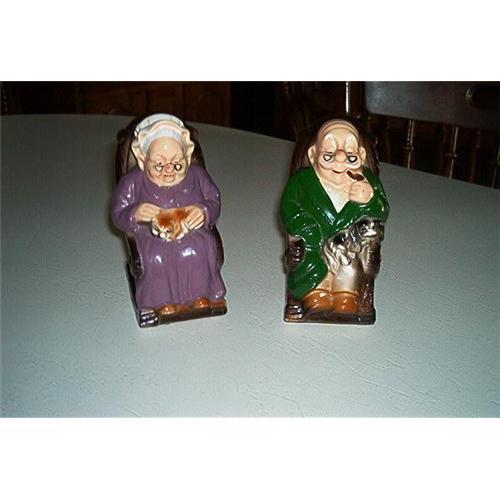 Here are two beautiful Pacific Retirement Banks. (Grandma & Grandpa). Both are setting in rocking chairs. Grandma is holding a cat in her lap and Grandpa is holding a dog. Both have grey hair, and Grandpa is also smoking a pipe. Each figurine has a slot on the back of their chairs to put your change in. The back of both chairs have embossed lettering: RETIREMENT FUNDS. Both rockers are brown; Grandma has a purple dress on and Grandpa has a green robe on. Both banks have a rubber cap on the bottom to take the change out easily. Made by Pacific-Japan. The banks measures 5 3/4 inches high and 2 1/2 inches wide and 3 1/2 inches long. Two highly glazed banks.