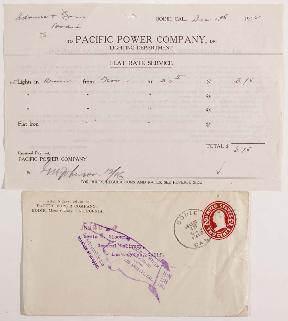 A December 1912 $3.75 PACIFIC POWER COMPANY billhead for "5 LIGHTS IN BARN FROM NOV 1 TO 30TH" addressed to [ADAMS & CAIN] of Bodie. Also, an empty Jun 1912 envelope addressed to Lewis. W. Slocum of Los Angeles. Cover has corner card of the the Pacific Power Company.