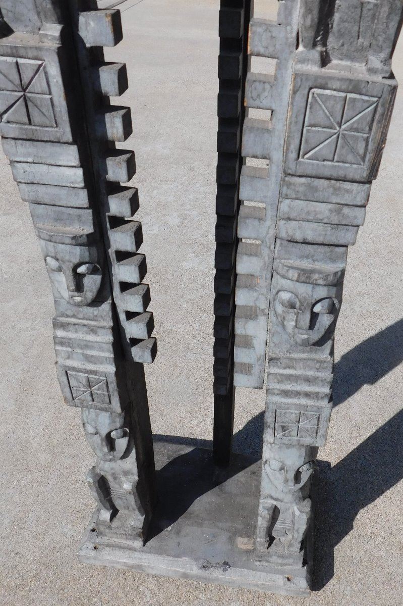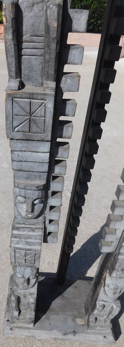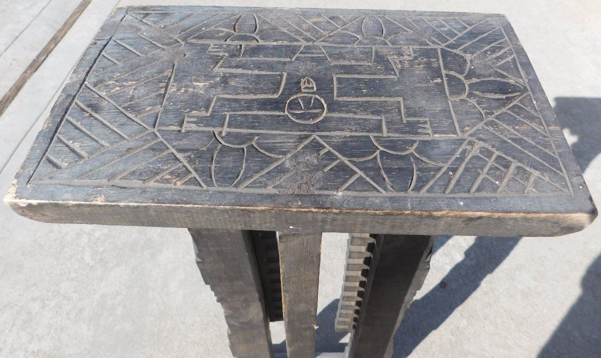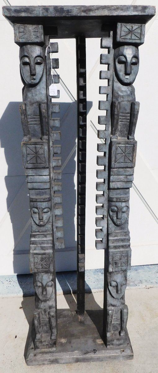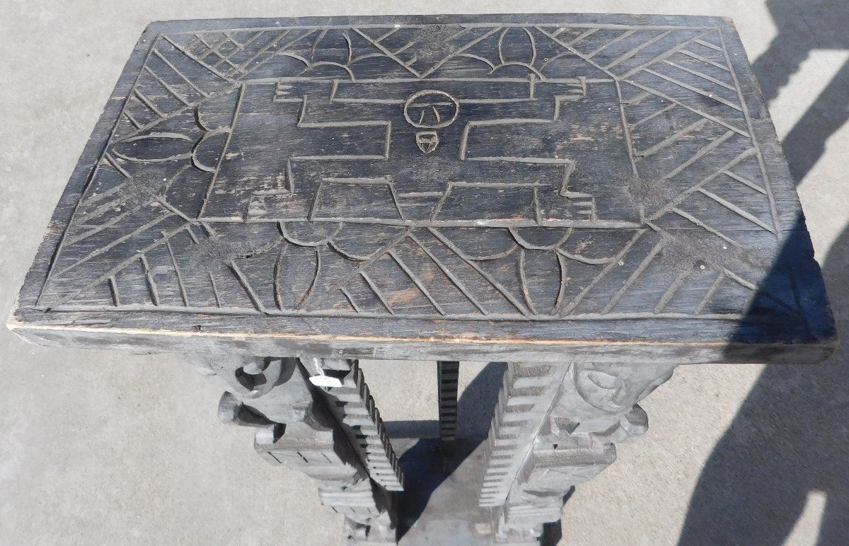 Pacific Rim Effigy Altar, circa 1940s. Made of wood and stained, the item is 38" x 13" x 8". Likely from Indonesia. Lizard effigy on top of table. Condition: Some stains and scratches, totem poles on front, see images. Shipping: $100.00 USA estimate only, due to size and weight w/insurance and signature. Foreign bidders will be responsible for the export of this item.