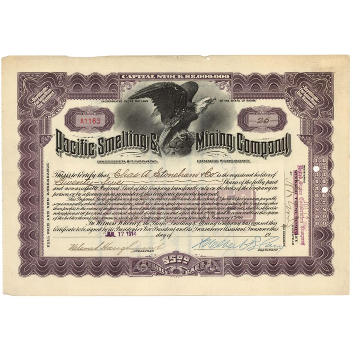Stock certificates from the United States and other countries around the world. Items offered cover a wide variety of collecting topics including automotive, railroads, mining, autographed and much more.