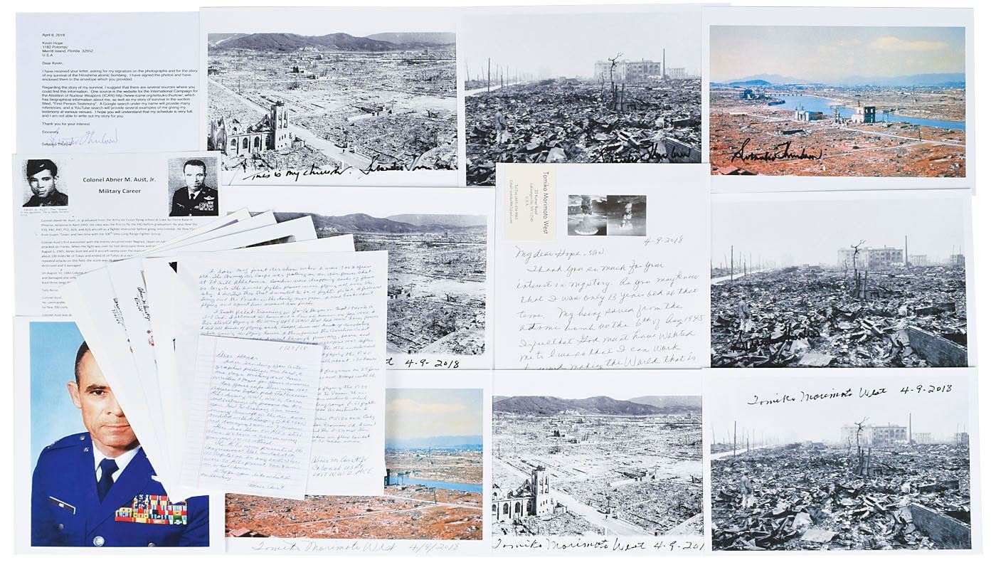 Remarkable collection of 31 items signed by soldiers of the Pacific Theatre and survivors of the Hiroshima blast, consisting mostly of ALSs, including: Abner M. Aust (3 letters and 5 SPs); Walter Bruska; Charles Caldwell (info sheet); Wallace Gustafson; Hamilton Hunter; William Kaenzig; Louis Mamula; Wally Reynolds; Joseph H. Sasser, Jr.; James Scotella; Ben Skardon; Setsuko Thurlow (TLS and four SPs); Tomiko Morimoto West (ALS and four SPs); Cecil Wiswell (2); and John Woolston. In overall fine to very fine condition. Accompanied by the original mailing envelopes, other related ephemera, and an unsigned handwritten letter from an unknown soldier.