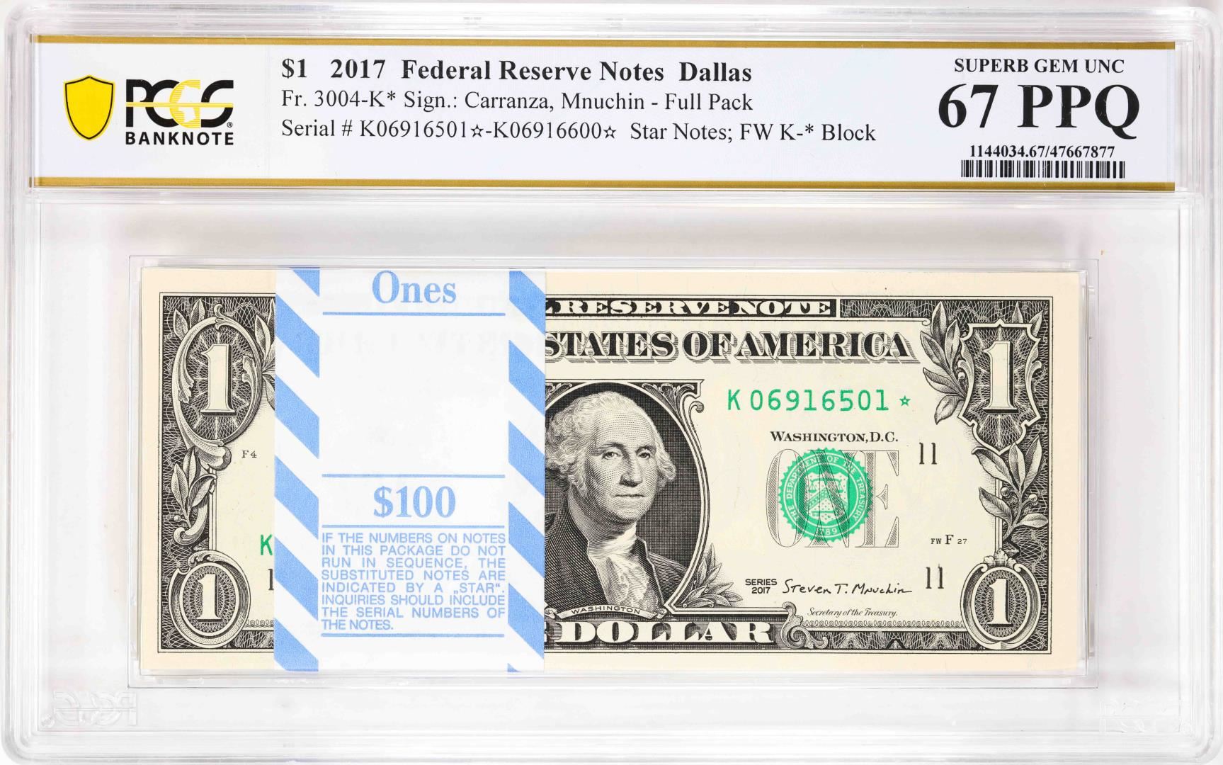 One Pack 2017 $1 Federal Reserve STAR Notes Dallas Fr.3004-K* PCGS Superb Gem Unc 67PPQ. PCGS Graded.