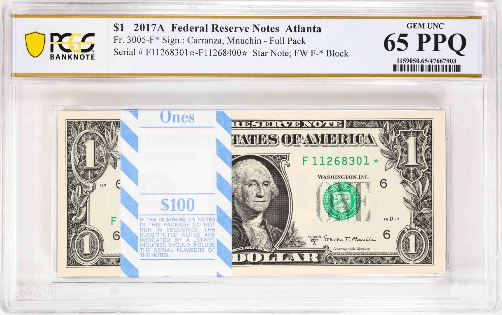 One Pack 2017A $1 Federal Reserve STAR Notes ATL Fr.3005-F* PCGS Gem Uncirculated 65PPQ. PCGS Graded.