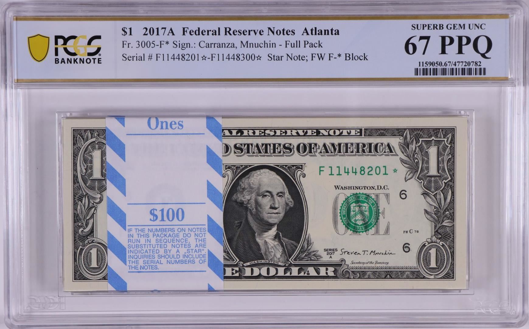 One Pack 2017A $1 Federal Reserve STAR Notes Atlanta Fr.3005-F* PCGS Superb Gem UNC 67PPQ. PCGS Graded.