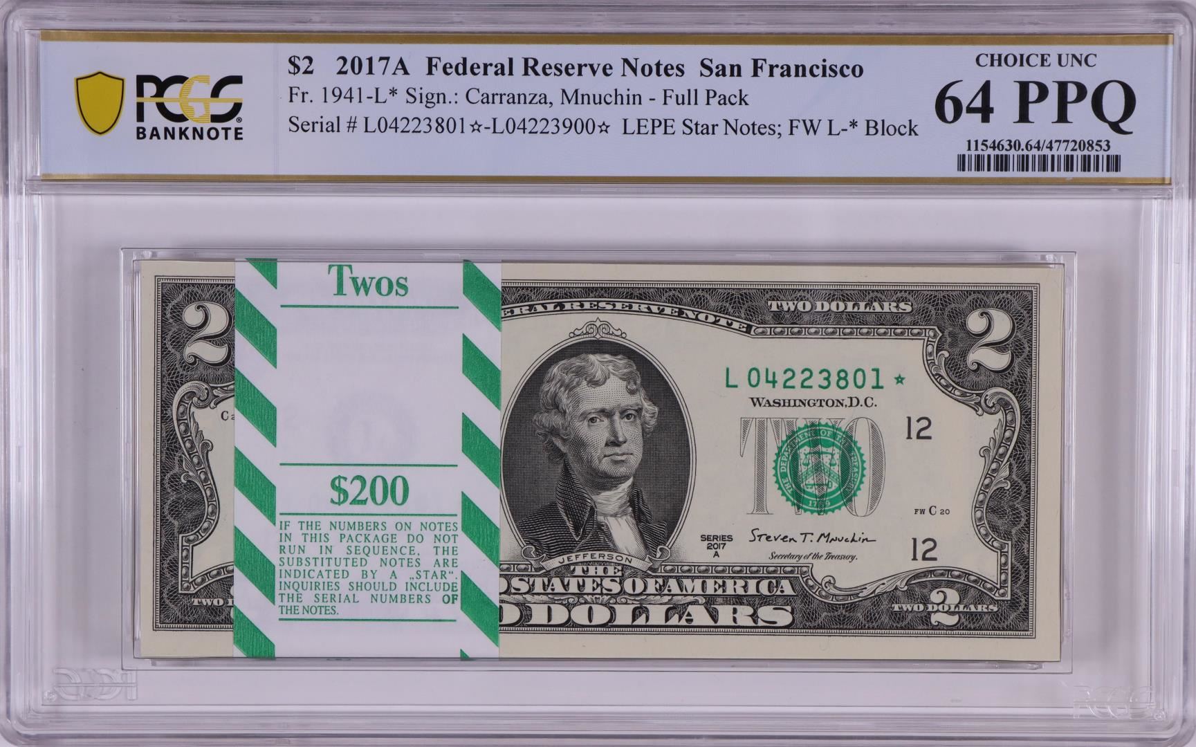 One Pack 2017A $2 Federal Reserve STAR Notes SF Fr.1941-L* PCGS Choice Uncirculated 64PPQ. PCGS Graded.
