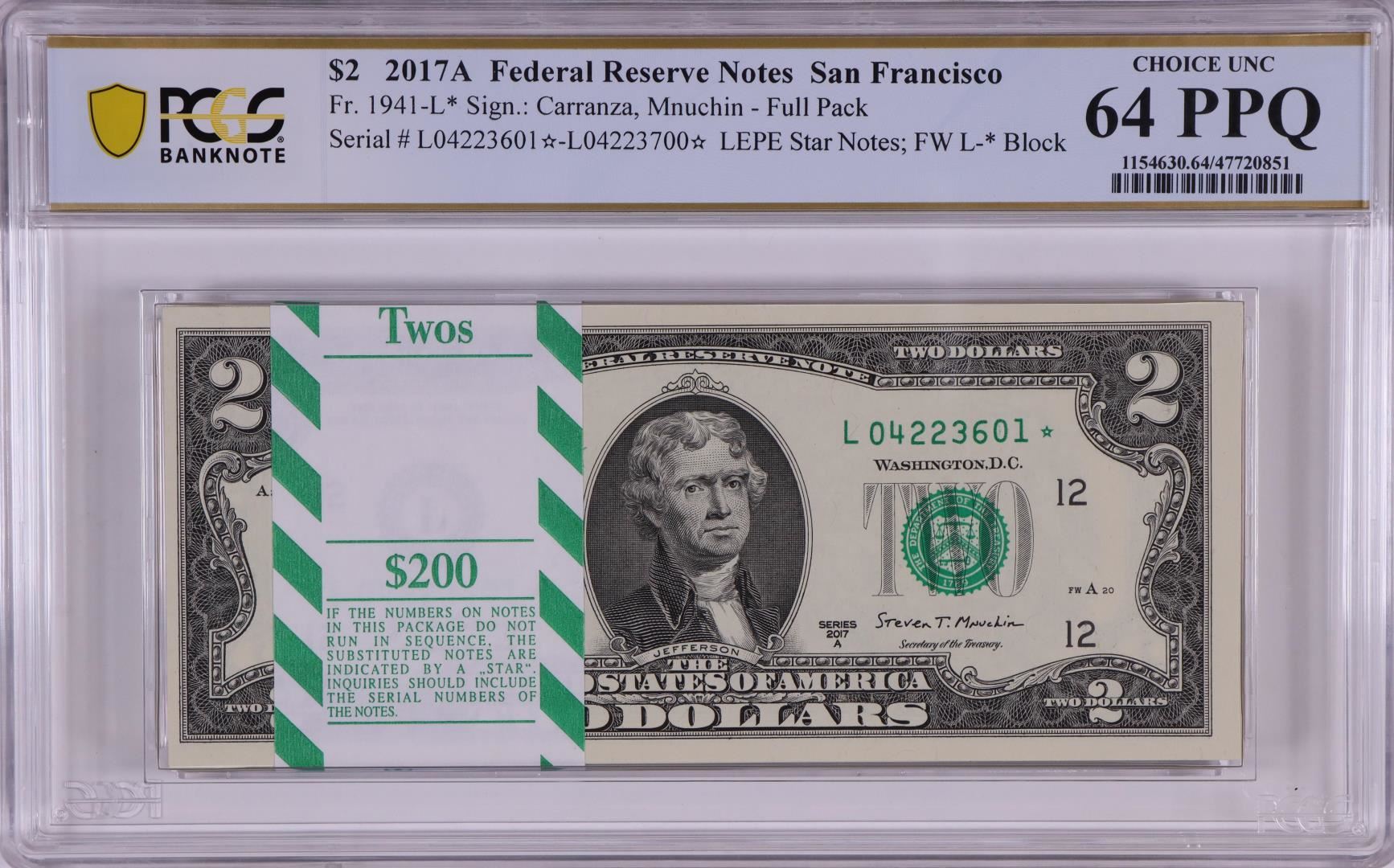One Pack 2017A $2 Federal Reserve STAR Notes SF Fr.1941-L* PCGS Choice Uncirculated 64PPQ. PCGS Graded.