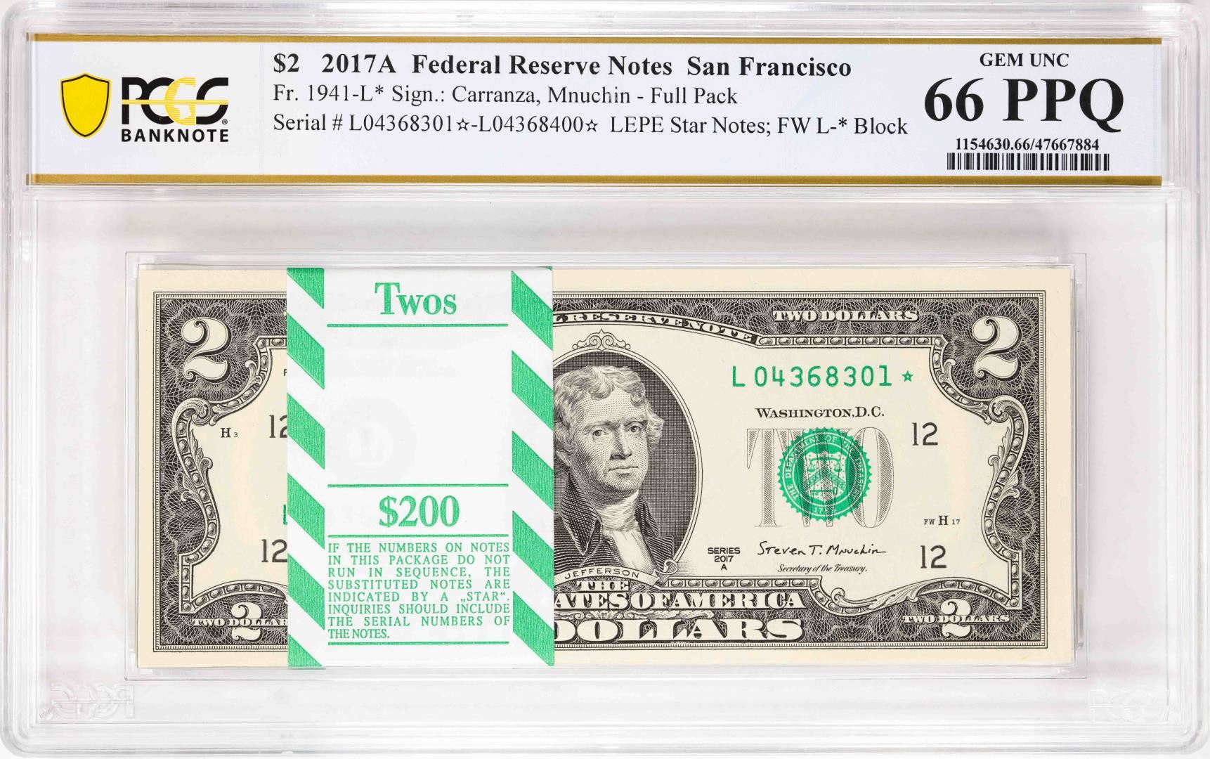 One Pack 2017A $2 Federal Reserve STAR Notes SF Fr.1941-L* PCGS Gem Uncirculated 66PPQ. PCGS Graded.