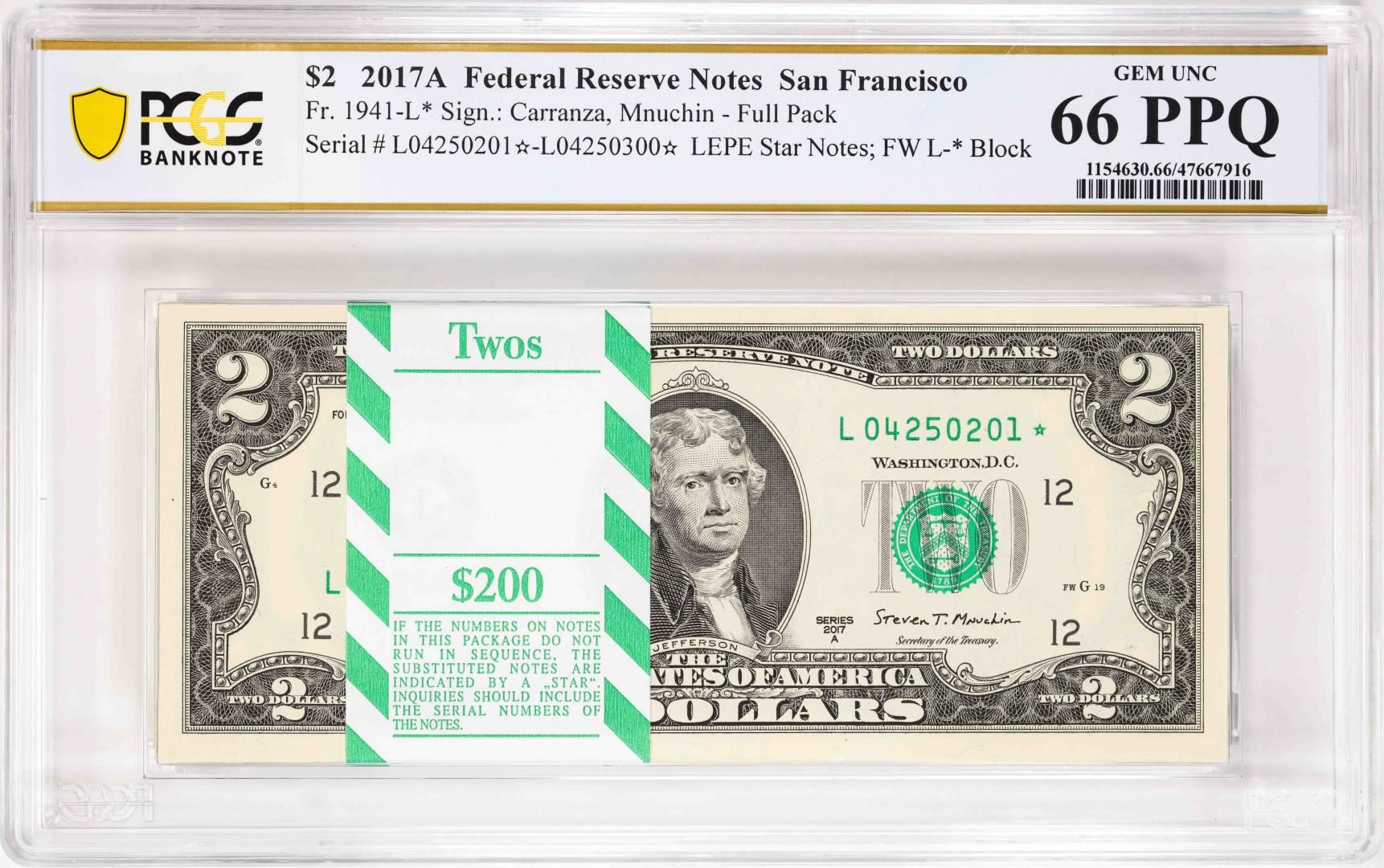 One Pack 2017A $2 Federal Reserve STAR Notes SF Fr.1941-L* PCGS Gem Uncirculated 66PPQ. PCGS Graded.
