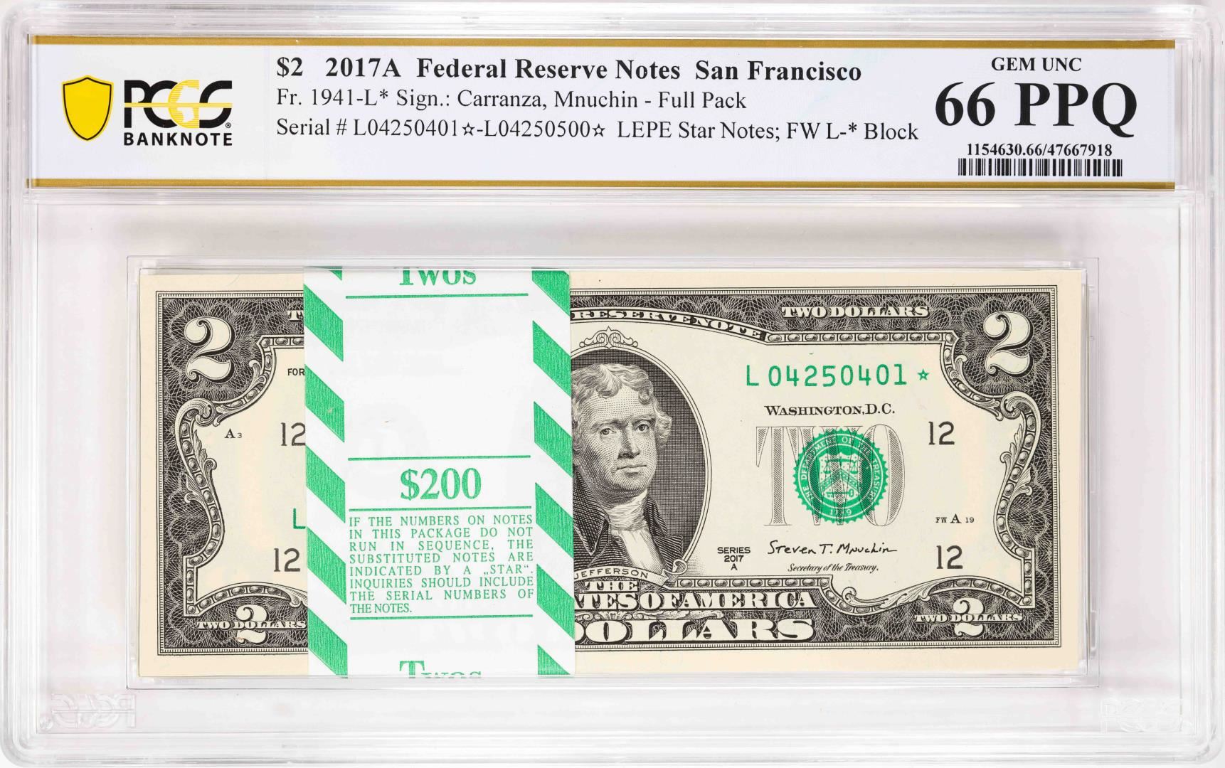 One Pack 2017A $2 Federal Reserve STAR Notes SF Fr.1941-L* PCGS Gem Uncirculated 66PPQ. PCGS Graded.
