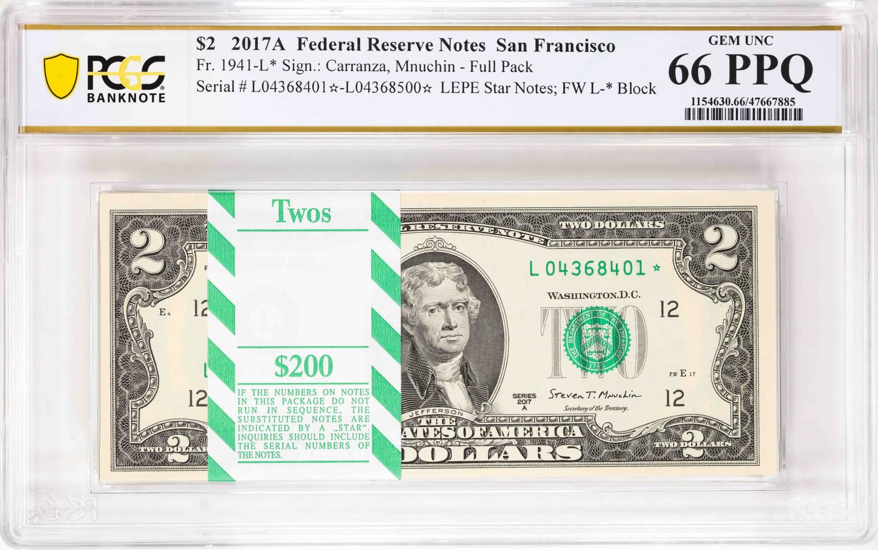 One Pack 2017A $2 Federal Reserve STAR Notes SF Fr.1941-L* PCGS Gem Uncirculated 66PPQ. PCGS Graded.