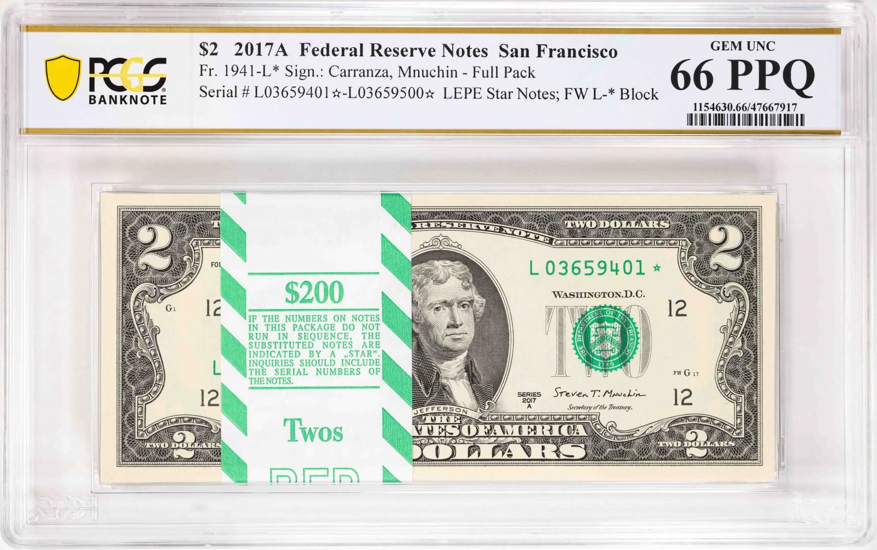 One Pack 2017A $2 Federal Reserve STAR Notes SF Fr.1941-L* PCGS Gem Uncirculated 66PPQ. PCGS Graded.