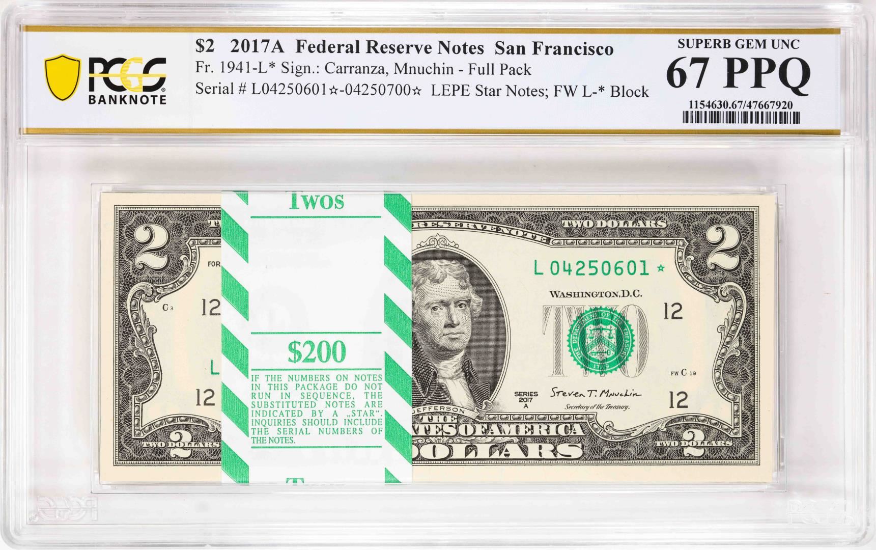 One Pack 2017A $2 Federal Reserve STAR Notes SF Fr.1941-L* PCGS Superb Gem Unc 67PPQ. PCGS Graded.