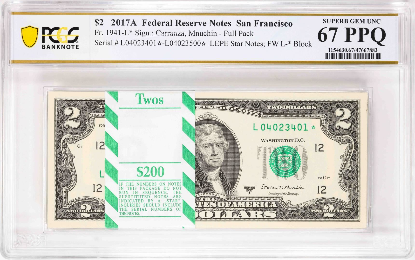 One Pack 2017A $2 Federal Reserve STAR Notes SF Fr.1941-L* PCGS Superb Gem Unc 67PPQ. PCGS Graded.