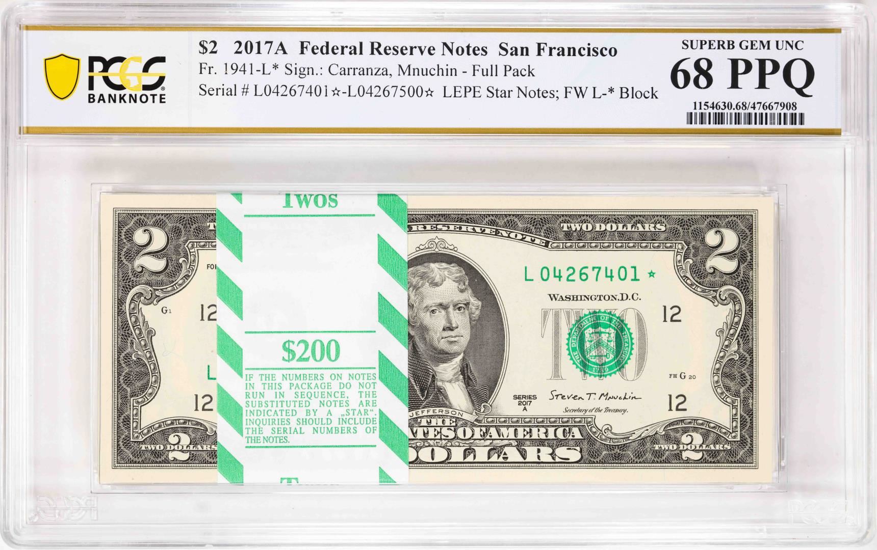One Pack 2017A $2 Federal Reserve STAR Notes SF Fr.1941-L* PCGS Superb Gem Unc 68PPQ. PCGS Graded.