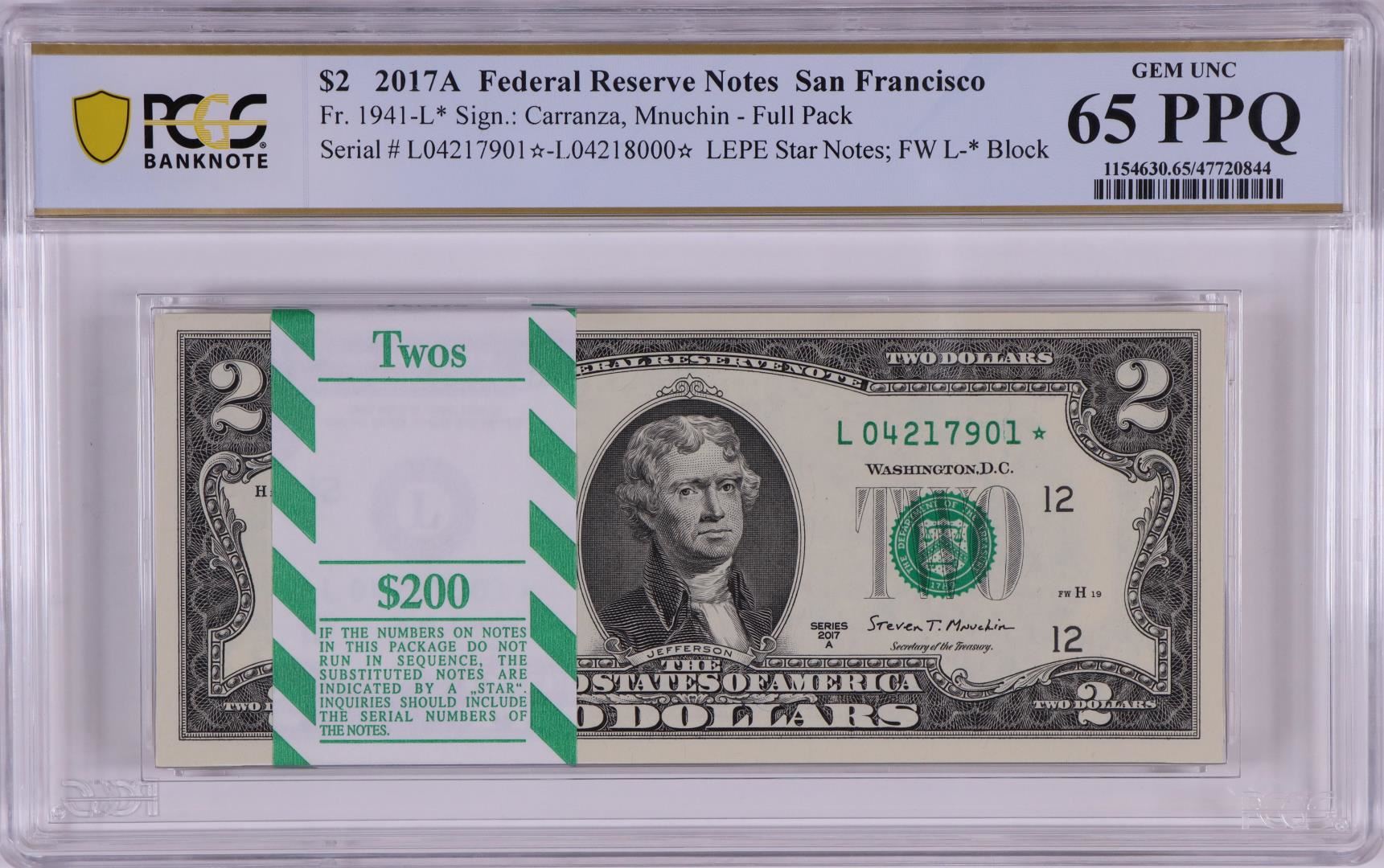 One Pack 2017A $2 Federal Reserve STAR Notes San Francisco Fr.1941-L* PCGS Gem UNC 65PPQ. PCGS Graded.